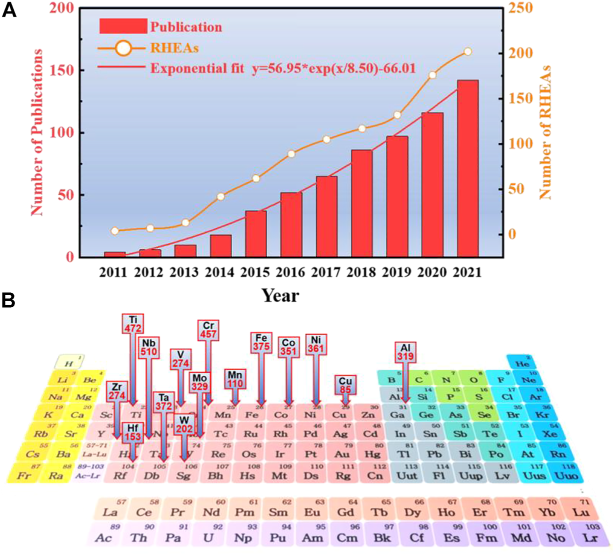 (A). The number of RHEA publications from 2011 to 2021 and the frequency of RHEA occurrences involved. The number of RHEA articles can be described by exponential growth . (B). The frequency of occurrence and the distribution of their positions on the periodic table of elements in the 953 RHEAs counted.