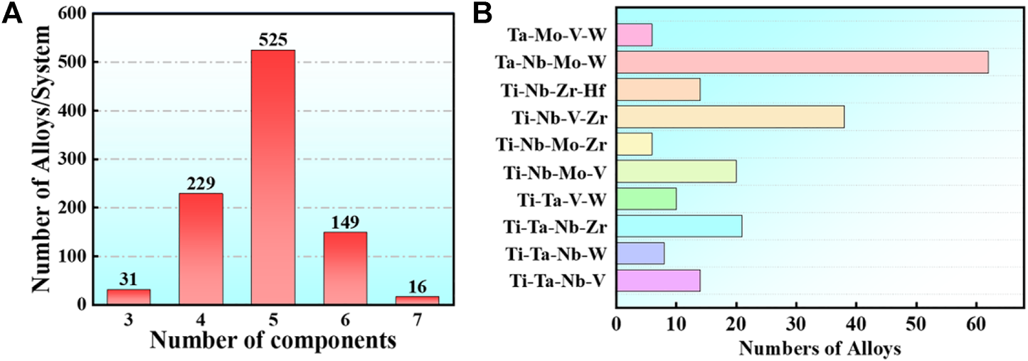 In the statistical publications, the frequencies of RHEAs of 3,4,5,6,7 group elements, respectively (A), while the frequencies of RHEAs based on the most common 4 group element systems of Ta-Nb-Mo-W, Ti-Nb-V-Zr, Ti-Nb-Mo-V, and Ti-Ta-Nb-V are in (B).