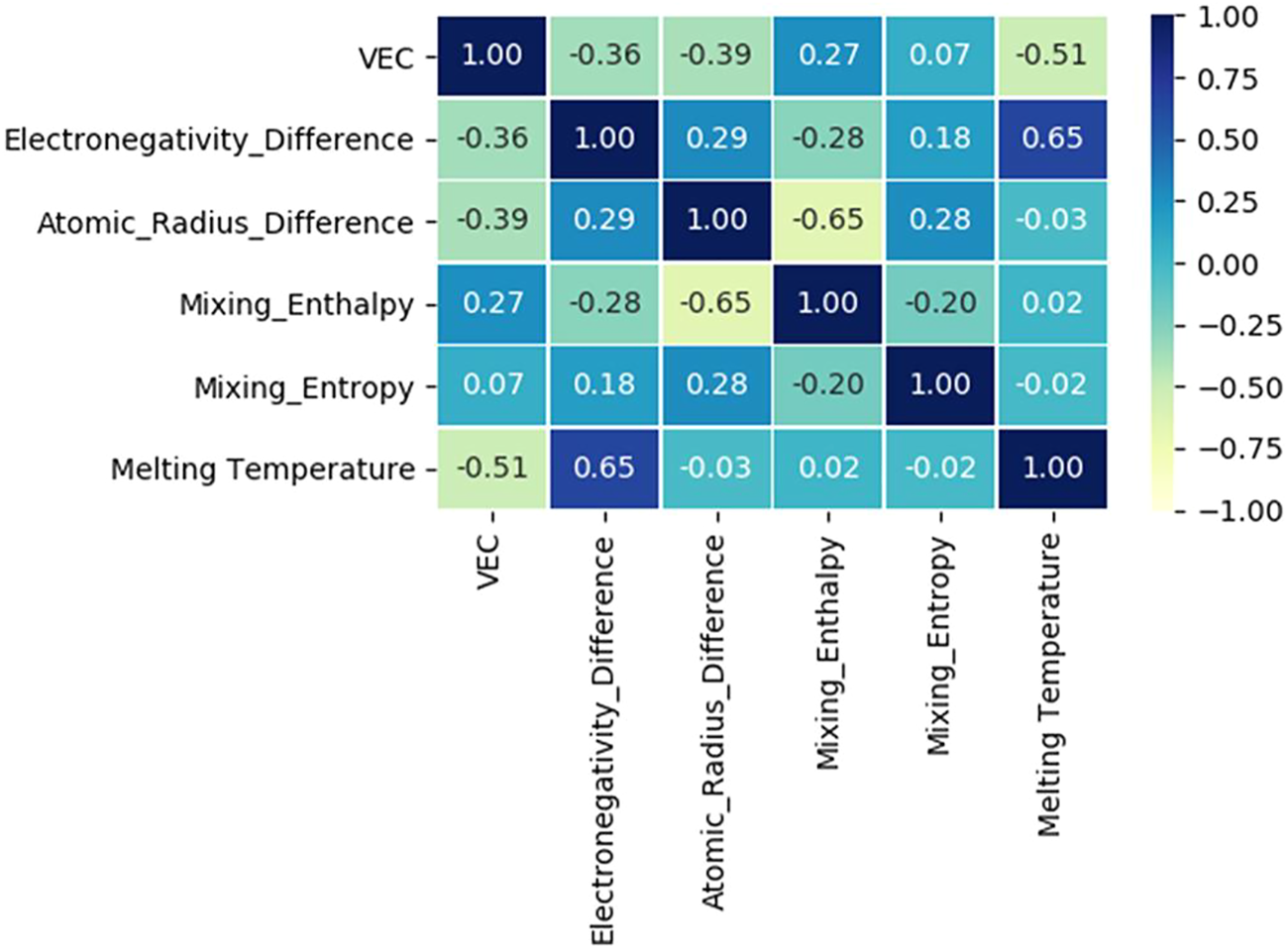 Heatmap of the correlation matrix between six relevant features, including VEC, electronegativity difference, mixing enthalpy, atomic size difference, mixing entropy, and melting temperature (Zhu et al., 2022).