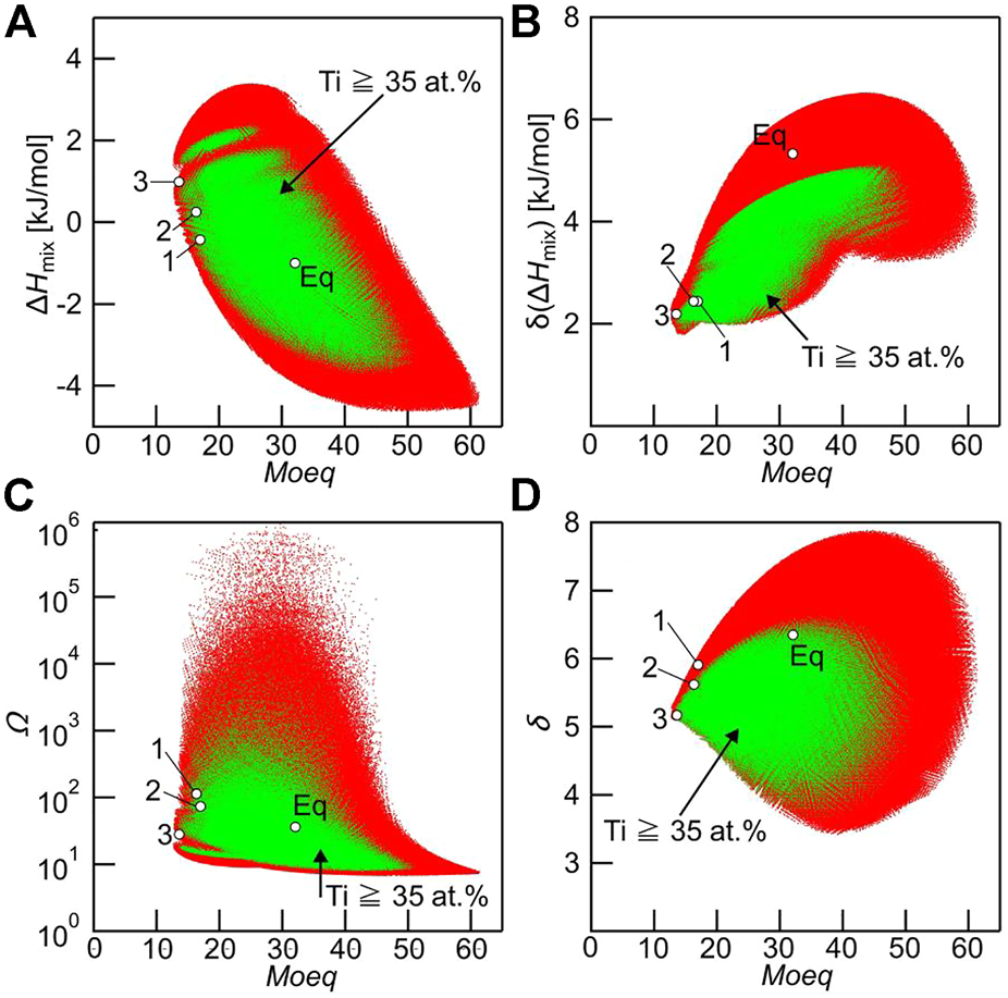 Relationship between Moeq and various empirical alloy parameters used to predict solid solution formation, including ΔHmix, δ (ΔHmix), Ω, and δ parameters in Ti-Zr-Hf-Nb-Ta-Mo alloys with ΔSmix ≥1.5 R (red dots). The green dot indicates the alloys whose Ti concentration was at and above 35 at% and considered the Ti-rich alloys. Hollow black circles (○) indicate the Ti–Zr–Hf–Nb–Ta–Mo alloy investigated in the present study. (A) Moeq vs ΔHmix, (B) Moeq vs δ(ΔHmix), (C) Moeq vs Ω, and (D) Moeq vs δ parameters (Iijima et al., 2021).