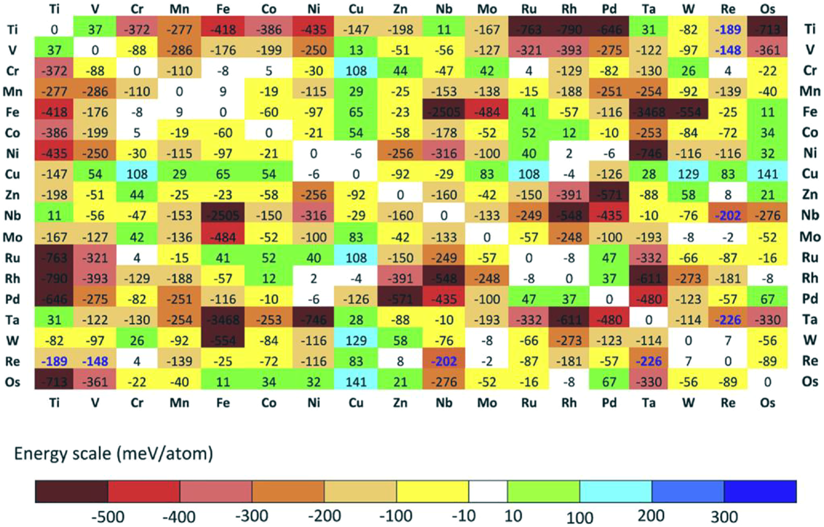 The DFT calculates the formation energy of the lowest energy structures in various binary relative to their phase separation into pure elements. If the numbers are in bold blue, the energies are evaluated relative to the respective solid solution (Troparevsky et al., 2015)