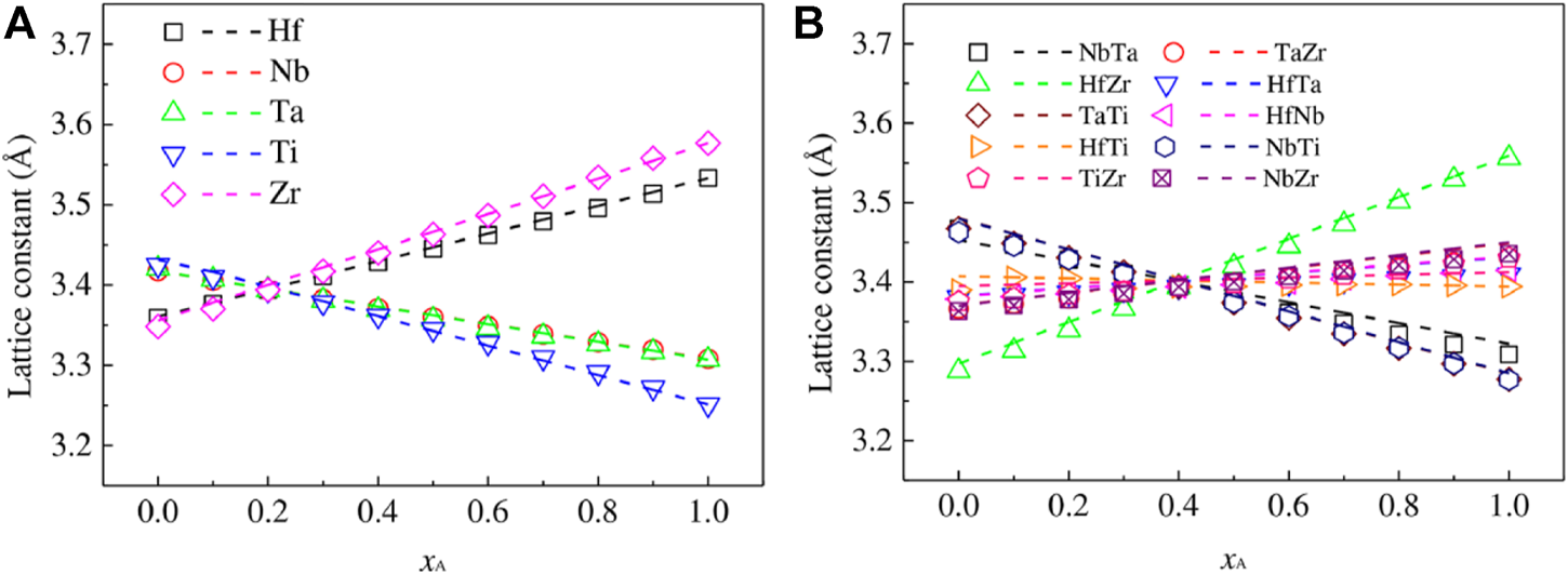 The final members of the lattice constants of the 1–4 (A) and 2–3 (B) pseudo-binary AxB1- x alloys as a function of the molar fraction. In subfigure (A), A represents one of the Hf-Nb-Ta-Ti-Zr elements, and B represents the other four elements. In subfigure (B), A represents two elements of Hf-Nb-Ta-Ti-Zr, while B represents the other three. The lattice constants that conform to Vegard’s law are shown as dashed lines (Chen S. M. et al., 2022)