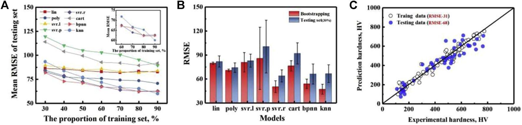 Test error evaluation of three different models, (A) a holdout method and (B) bootstrapping methods, indicating sur. r outperforms the bpnn and knn model. (C) The predicted values as a function of the measured values of the svr. r model for training data (randomly chosen 70%) and testing data (the rest 30%) (Wen et al., 2019)
