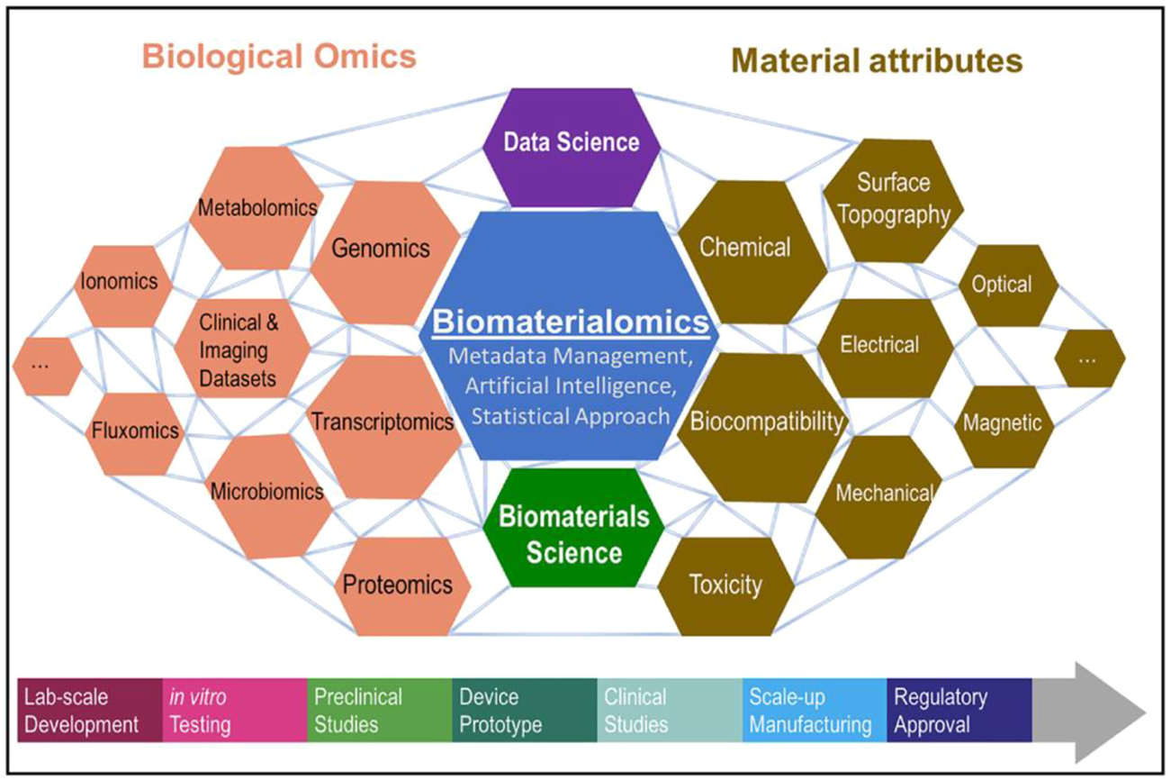Introducing the concept of biomaterialomics, an interdisciplinary study unraveling the relationship between biological data and material properties (Basu et al., 2022).