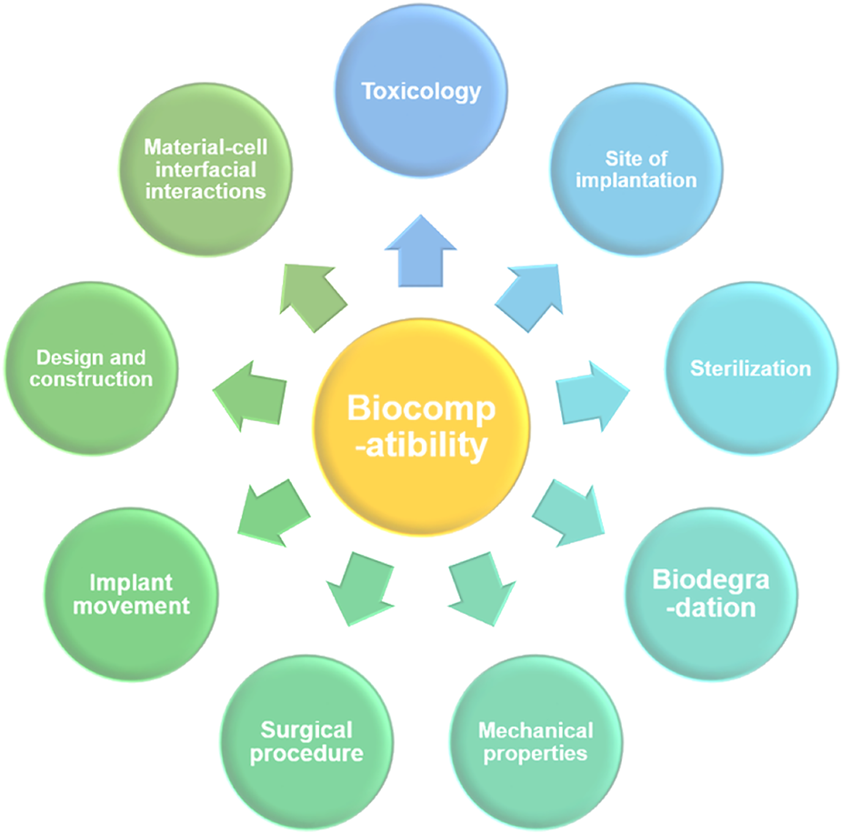 Due to the frequent occurrence of diseases, and other human injuries, the demand for implant materials has increased, and more attention has been paid to medical metal materials. In contrast, high-entropy alloys have become one of the most promising new medical materials in recent years due to their excellent performance and have been explored and researched by many scholars at home and abroad (Nagase et al., 2020). Bio-HEAs use Ti, Ta, Zr, Nb, and Hf elements with high biosafety and good biocompatibility. As a new bio-alloy material, Bio-HEAs require a series of biosafety assessments before they can be implanted in organisms, and the common factors affecting the biology of biomedical implants are shown in Figure 13. For Bio-HEA to be truly used in the clinical field as a biomedical implant, its biocompatibility needs to be experimentally proven by the mechanical, physical, and degradation properties, by sterilization (freeing the implant surface from all types of microorganisms), by toxicological aspects (examination and treatment of any toxins or toxic substances), by surgery, implant site and load-bearing capacity (Davis et al., 2022). Based on the existing research work, this chapter summarizes the biocompatibility performance of Bio-HEAs in terms of their cytocompatibility and corrosion resistance in physiological solutions.
