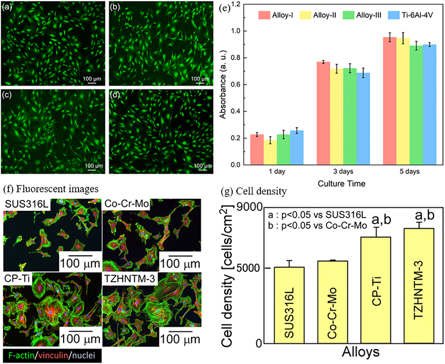 Live/dead staining of MC3T3-E1 cells on (A) Alloy-I, (B) Alloy-II, (C) Alloy-III, and (D) Ti64 after 72 h of incubation. (E) The proliferation of MC3T3-E1 cells on Alloy-I, Alloy-II, Alloy-III, and Ti64 after 1, 3, and 5 days of cell culture, respectively (Yang W. et al., 2022). Biocompatibility of the arc-melted isoatomic TiNbTaZrMo (TZHNTM-Eq) and non-isoatomic Ti28.32Zr28.32Hf28.32Nb6.74Ta6.74Mo1.55 (TZHNTM-3) and SUS316L stainless steel, ASTM F1537-08 of Co-Cr-Mo alloy and commercially pure titanium (CP-Ti) were used as references. (F) Quantitative analysis of the density of osteoblasts cultured on the fabricated specimens by staining images with Giemsa and (G) fluorescent images of osteoblast adhesion on the fabricated specimens (Iijima et al., 2021).