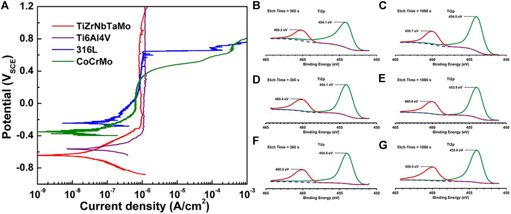 Potentiodynamic polarization curve measurement is one of the most widely used measurements in electrochemical corrosion (Gu M. et al., 2022; Li et al., 2022), which can provide information on the corrosion rate and corrosion mechanism of bio-alloy materials under a simulated physiological environment and evaluate the bio-suitability of Bio-HEAs by chemical corrosion conditions. In the corrosion reaction, corrosion potential (Ecorr), corrosion current density (Icorr), and AC impedance are essential parameters for analyzing the corrosion resistance of the material, and the relevant parameters of some Bio-HEAs are listed as shown in Table 2. For Bio-HEAs with Ti and Ta elements, their lower Ecorr indicates that they will both readily form protective passivation layers (usually oxides) (Zheng et al., 2018). Most Bio-HEAs have no pitting reaction until 2V, which means promising applications in human environments around 0–0.2 V. No pitting and no localized corrosion due to the breakdown of the protective passivation films, dramatically increasing the lifetime of alloy implants (Hwang et al., 2019; Li T. et al., 2021). The corrosion current density indicates the corrosion rate of the material. The lower the Icorr value, the lower the corrosion rate of the material, and the low Icorr value of Bio-HEAs indicates that it is preferable in medical alloy implant applications (Zhu et al., 2021; Feng H. et al., 2022).