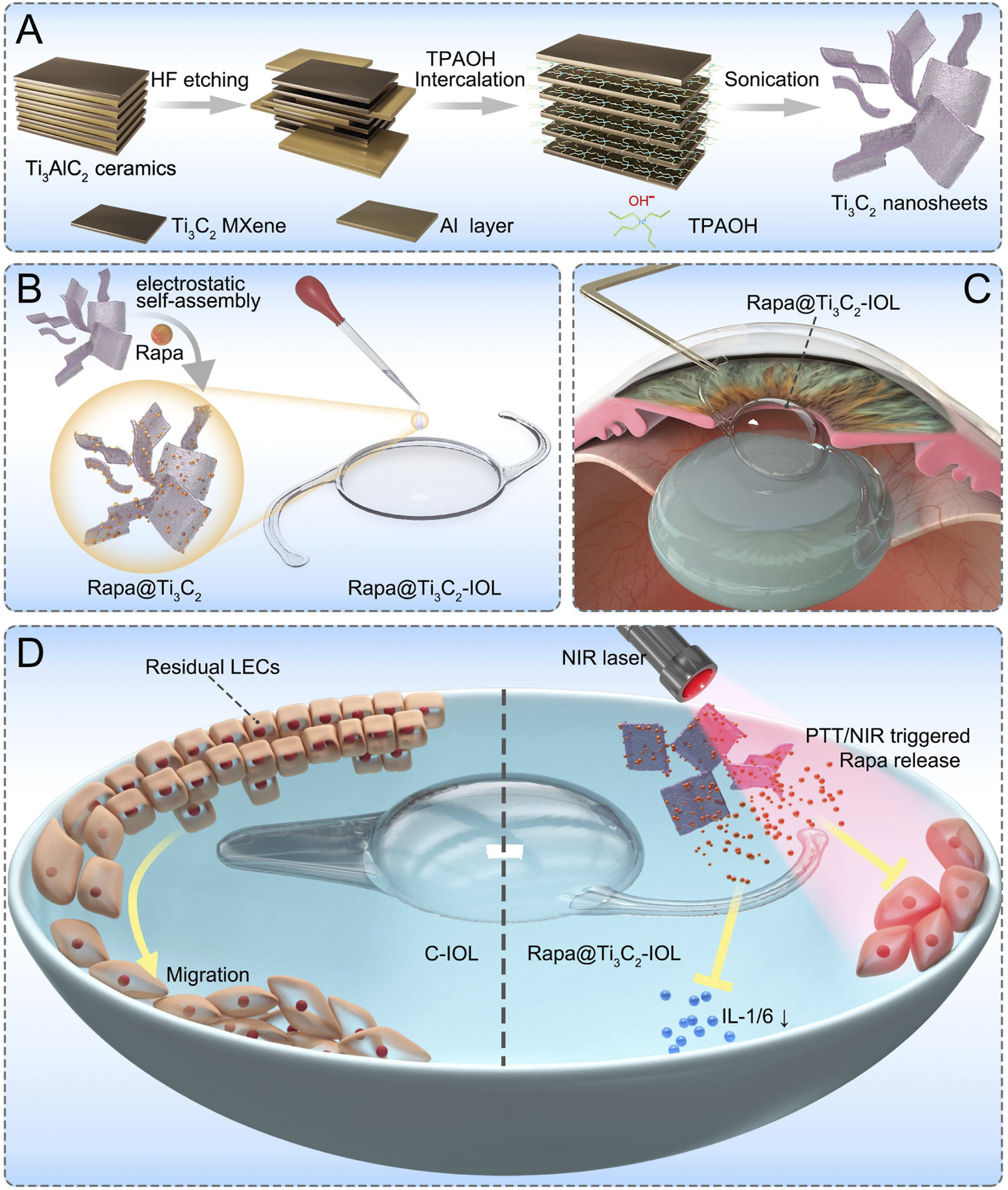 The scheme of Rapa@Ti3C2-IOL for synergistic photothermal and NIR-controllable Rapa releasing therapy for preventing PCO. (A) The synthetic process of Ti3C2 nanosheets. (B) The fabrication of Rapa@Ti3C2-IOL with a two-step spin coating method. (C) The implantation of Rapa@Ti3C2-IOL in a rabbit model of PCO. (D) The synergistic photothermal and NIR-controllable Rapa releasing effect of Rapa@Ti3C2-IOL against PCO.