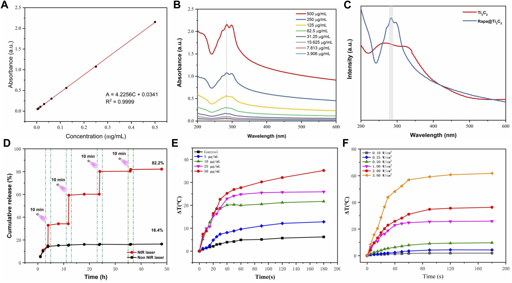 When evaluating NIR-controlled drug release, the Rapa@Ti3C2 solution was irradiated by a NIR laser (808 nm). The absorbance of the solution was determined at λ = 278 nm at given time intervals to calculate the Rapa releasing percentage.