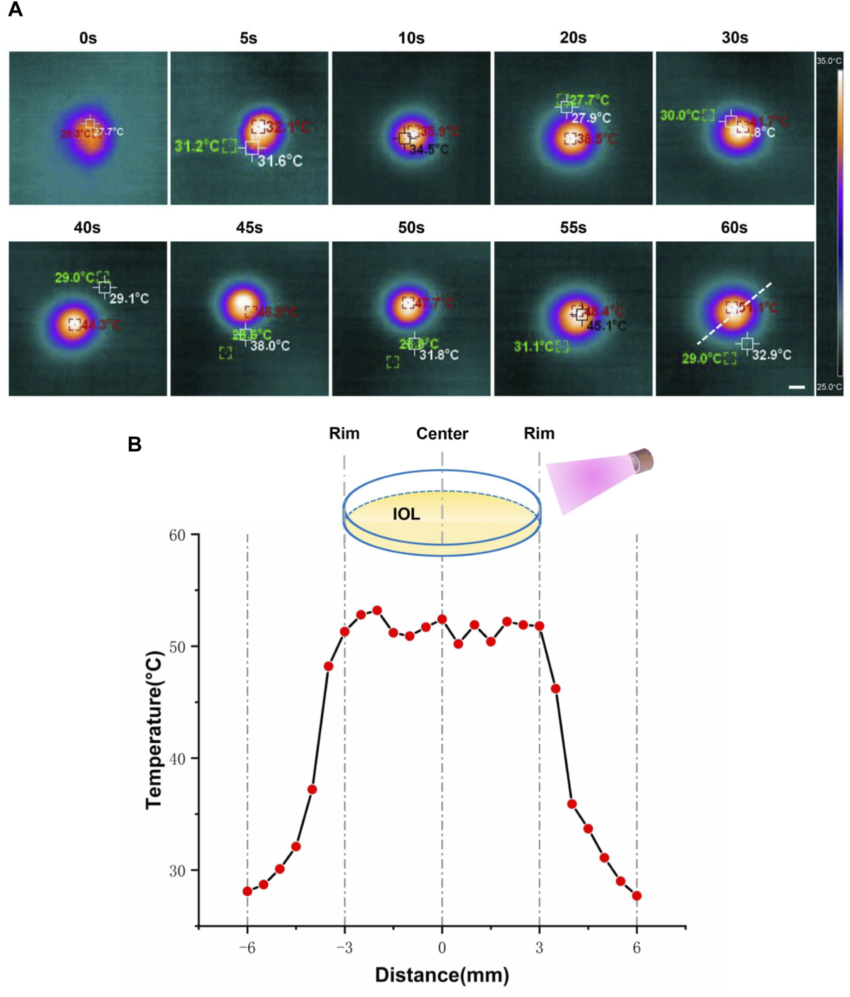 In vitro photothermal performance of Rapa@Ti3C2-IOL. (A) Rapa@Ti3C2-IOLs were irradiated by 808 nm NIR (1 W/cm2) for 60 s, and the temperatures of Rapa@Ti3C2-IOLs were recorded by infrared thermal imager every 5 s. (B) The temperature of the optical region of IOL with a diameter of 6 mm could reach more than 50°C, and the temperature of the region outside the optical region decreased to below 30°C.