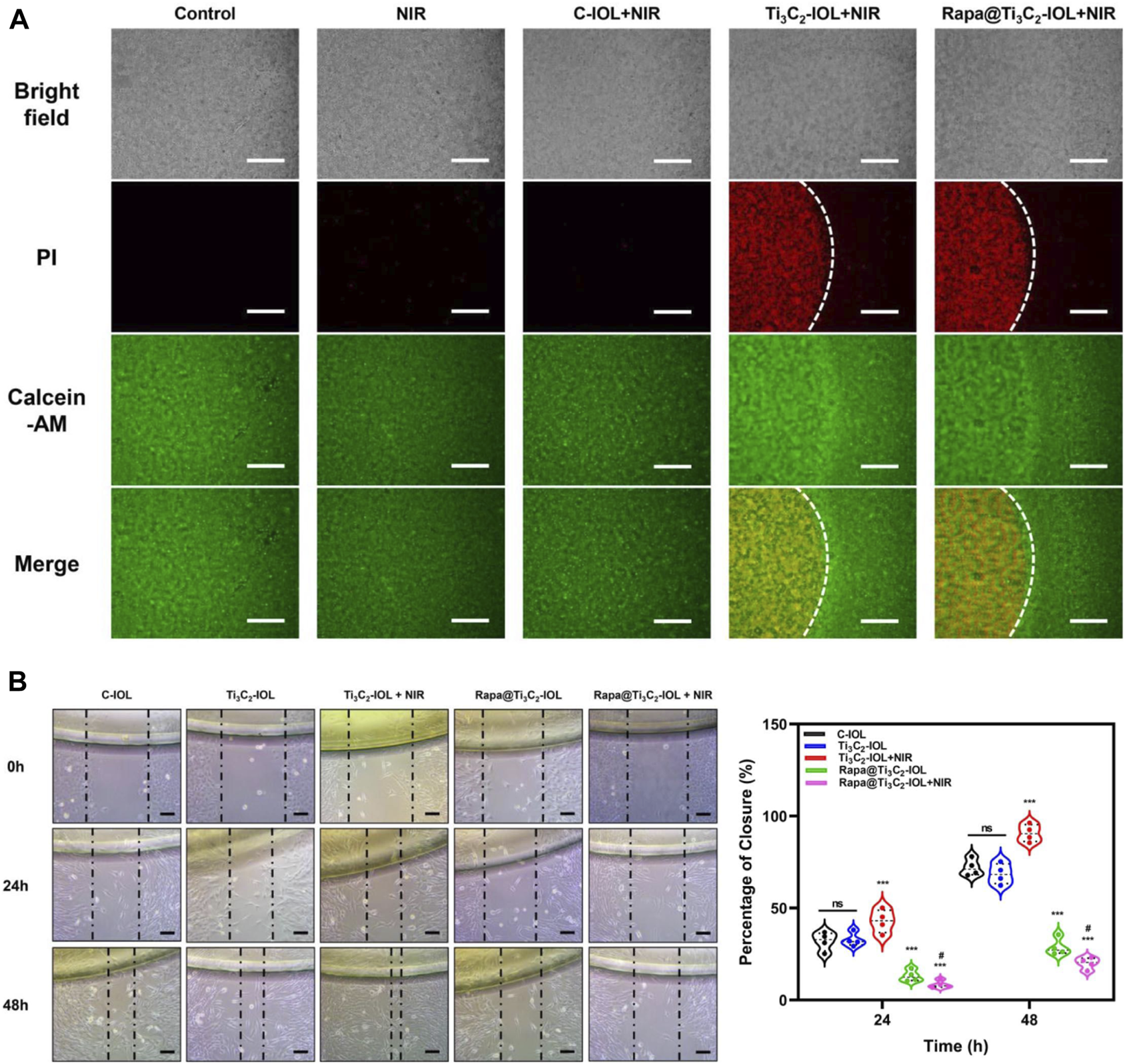 Photothermal ablative and anti-migrative effect of Rapa@Ti3C2-IOL in vitro. (A) Live/dead dual staining of LECs. The cells covered by Ti3C2-IOL and Rapa@Ti3C2-IOL irradiated with NIR laser (1 W/cm2) for 10 min. (B) The wound healing assay showed the effects of different IOLs on LECs migration. Scale bar = 500 μm.