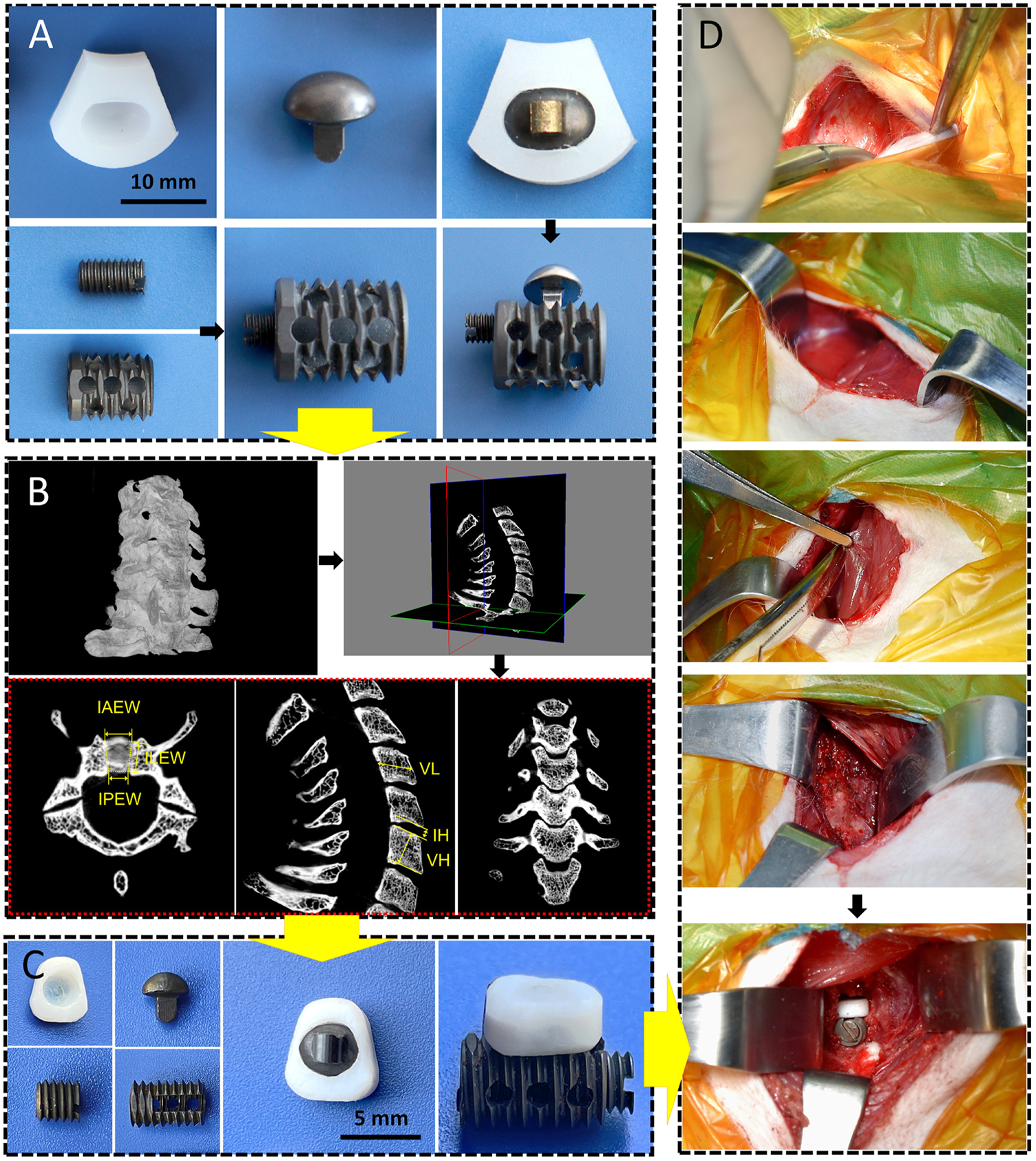 CSDP design, improvement, and implantation. (A) The cervical subtotal discectomy prosthesis (CSDP) design. Four components: CDP structure, link structure, CVF structure, and locking screw. (B) Cervical spine micro-CT anatomical measurements in transverse, sagittal, and coronal planes. IAEW, intervertebral anterior edge width. IPEW, intervertebral posterior edge width. ILEW, intervertebral lateral edge width. IH, intervertebral height. VH, vertebral height. VL, vertebral length. (C) Improved CSDP for non-human primate. (D) Construction of non-human primate model of CSDP implantation.