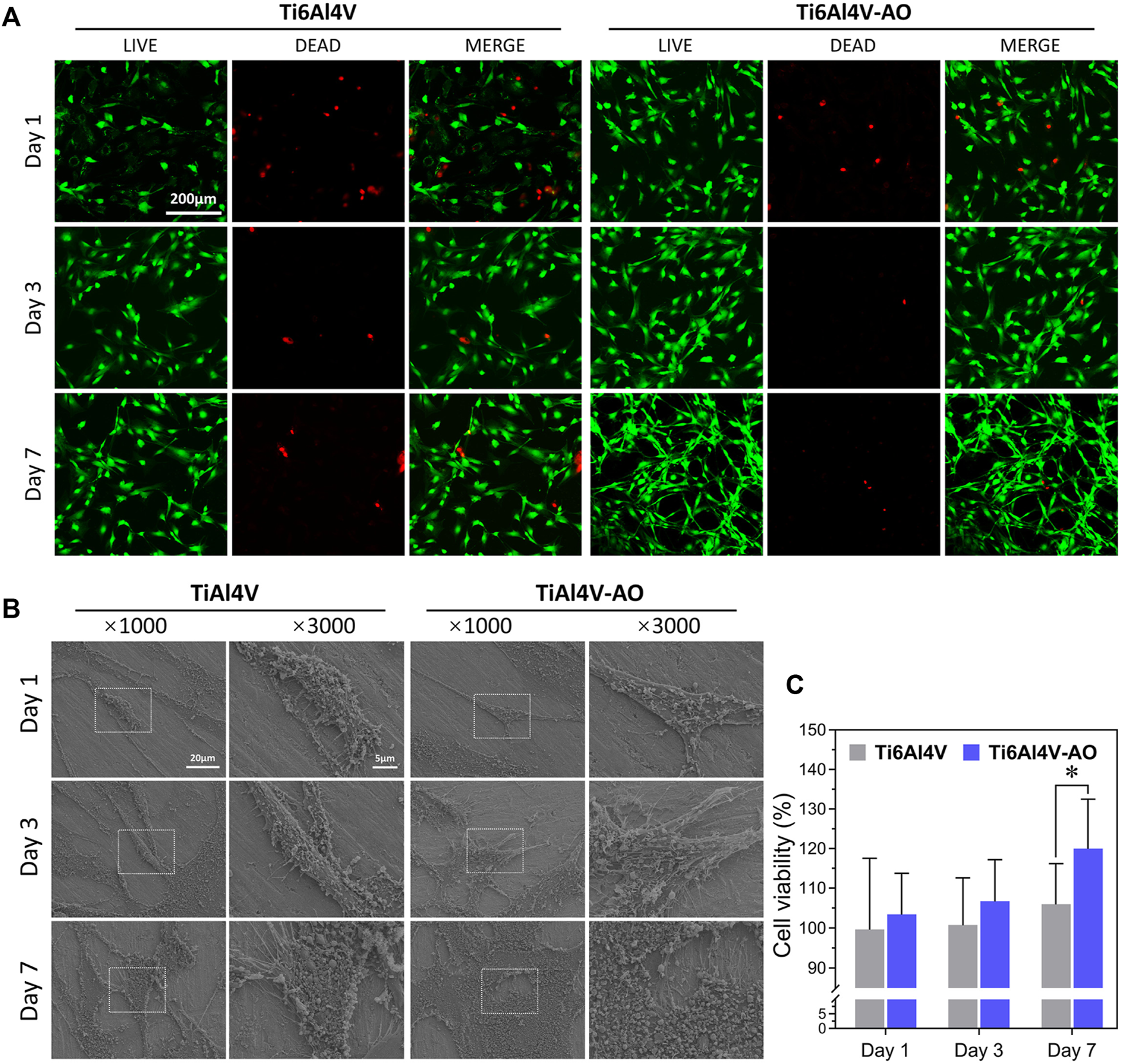 Biocompatibility detection of CSDP in vitro. (A) LIVE/DEAD cell viability observation. The cell viability of MC3T3-E1 cells co-cultured with Ti6Al4V-AO and Ti6Al4V for 1, 3, and 7 days. (B) Cell adhesion morphology scanning electron microscopy observation. The adhesive cell morphology of MC3T3-E1 cells co-cultured with Ti6Al4V-AO and Ti6Al4V for 1, 3, and 7 days. (C) CCK-8 cell proliferation rate detection. The proliferation rate of MC3T3-E1 cells co-cultured with Ti6Al4V-AO and Ti6Al4V for 1, 3, and 7 days. (n = 4). *p < 0.05.