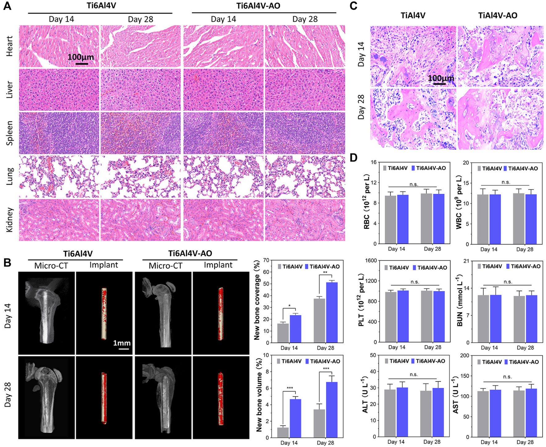 The overall observation of 3D reconstruction images of the femurs suggested that no infection, osteolysis, or osteonecrosis occurred around the implants in either group, at 14 or 28 days post-operation. As early as 14 days post-operation, new cancellous bone (red) was formed on the surface of the implant, and bone connection between the metal pin implants and the femoral cortical bone was observed. However, both the coverage and the volume of new bone on the pins of the Ti6Al4V-AO group were significantly more extensive than those in the control group (p < 0.05, n = 12) (Figure 3B). Growing coverage of new cancellous bone in both groups was observed 28 days after surgery, but the increase was more obvious on the surface of Ti6Al4V-AO. Additionally, new bone trabeculae were observed around all implants in the pathological sections of the femur, and the structure of the new bone trabeculae was clearly displayed. However, the number and density of new bone trabeculae around the Ti6Al4V-AO metal pins were better than those in the control group, at both 14 and 28 days post-operation (Figure 3C).