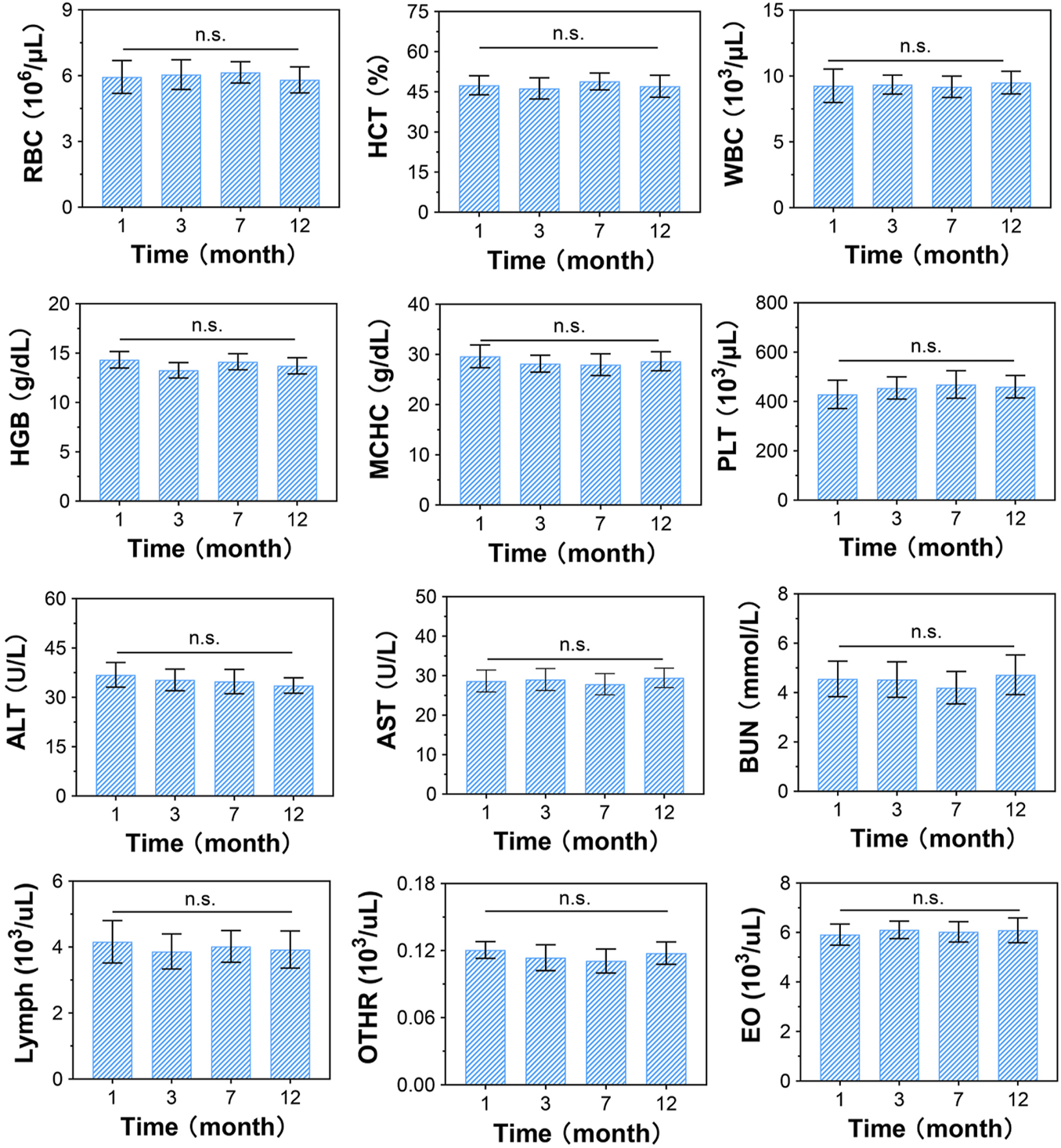 Blood biochemical evaluation of CSDP implanted in non-human primate model. The blood routine includes red blood cells (RBCs), hematocrit (HCT), white blood cells (WBCs), hemoglobin (HGB), mean corpuscular hemoglobin concentration (MCHC), platelets (PLTs), lymphocytes (lymphs), neutrophils (OTHRs), and eosinophils (EOs). Blood levels of alanine aminotransferase (ALT) and aspartate aminotransferase (AST) used as liver function markers. Blood urea nitrogen (BUN) used as kidney function marker. n.s., no statistical difference (n = 8).