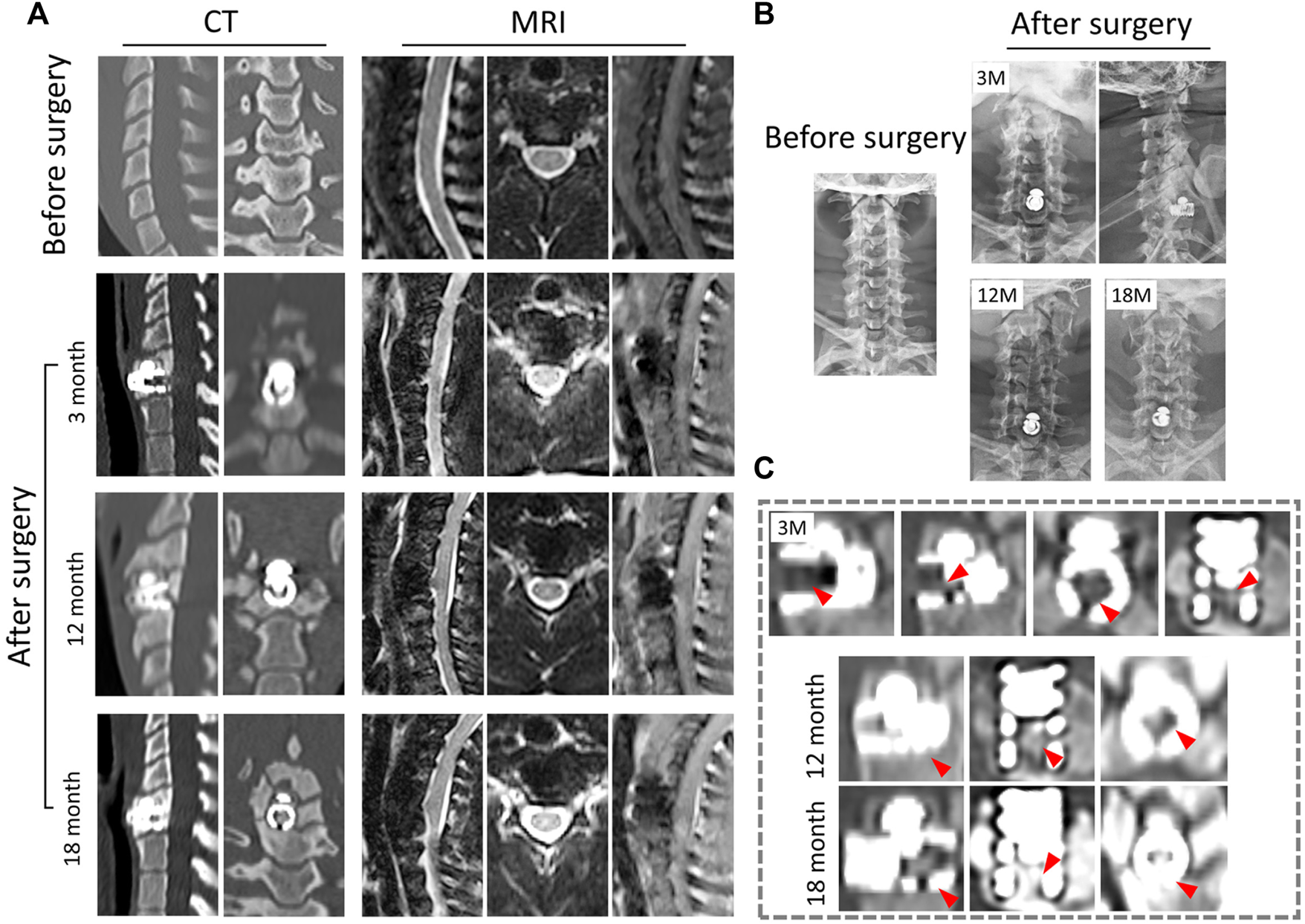 Radiological observation of CSDP in non-human primates. (A) CT and MRI 1 month before and 3, 12, and 18 months after CSDP implantation. (B) X-ray imaging 1 month before and 3, 12, and 18 months after CSDP implantation. (C) The trabecular bone gradually grew into the cervical vertebra fixation (CVF) structure through the tunnel at 3 months post-operation. Increased quantity and density of trabecular bone grew into the CVF structure, and the CSDP obtained intravertebral fusion at 1 year, then strengthened at 18 months post-surgery.