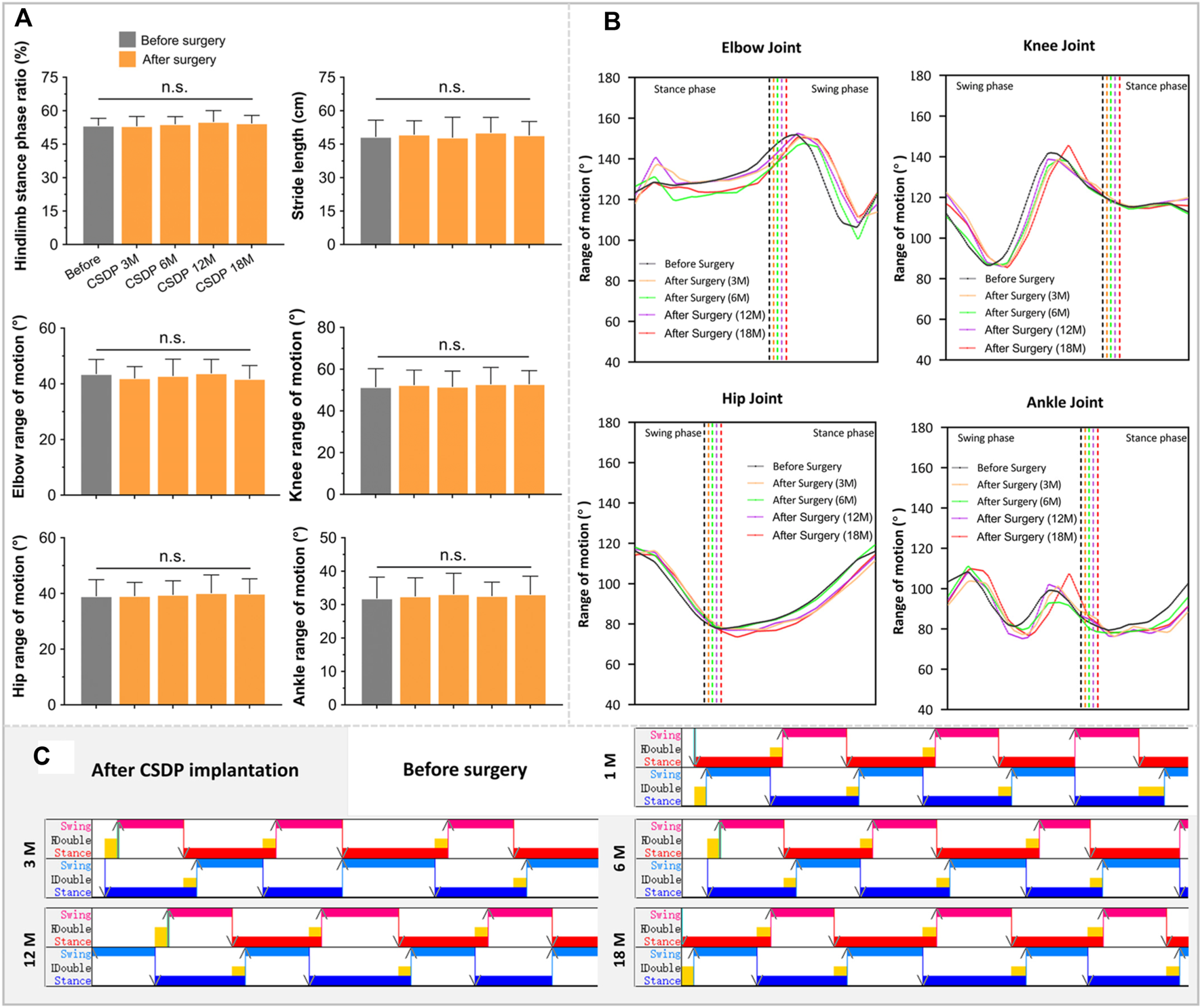 Functional impairment of the cervical spinal cord, a high spinal cord segment, could affect the motion of the limbs, which is reflected in gait. Kinematic analysis, a widely used method for recording joint motions in a variety of neuropathological conditions and which enables multi-planar and multi-dimensional motion assessment, is considered one of the most valuable methods for motor function evaluation in quadruped animal models (Diogo et al., 2021). To better understand the potential effect of CDSP implantation on cervical spine function in cynomolgus monkeys, quadruped locomotion was detected 1 month before and 3, 6, 12, and 18 months after surgery.