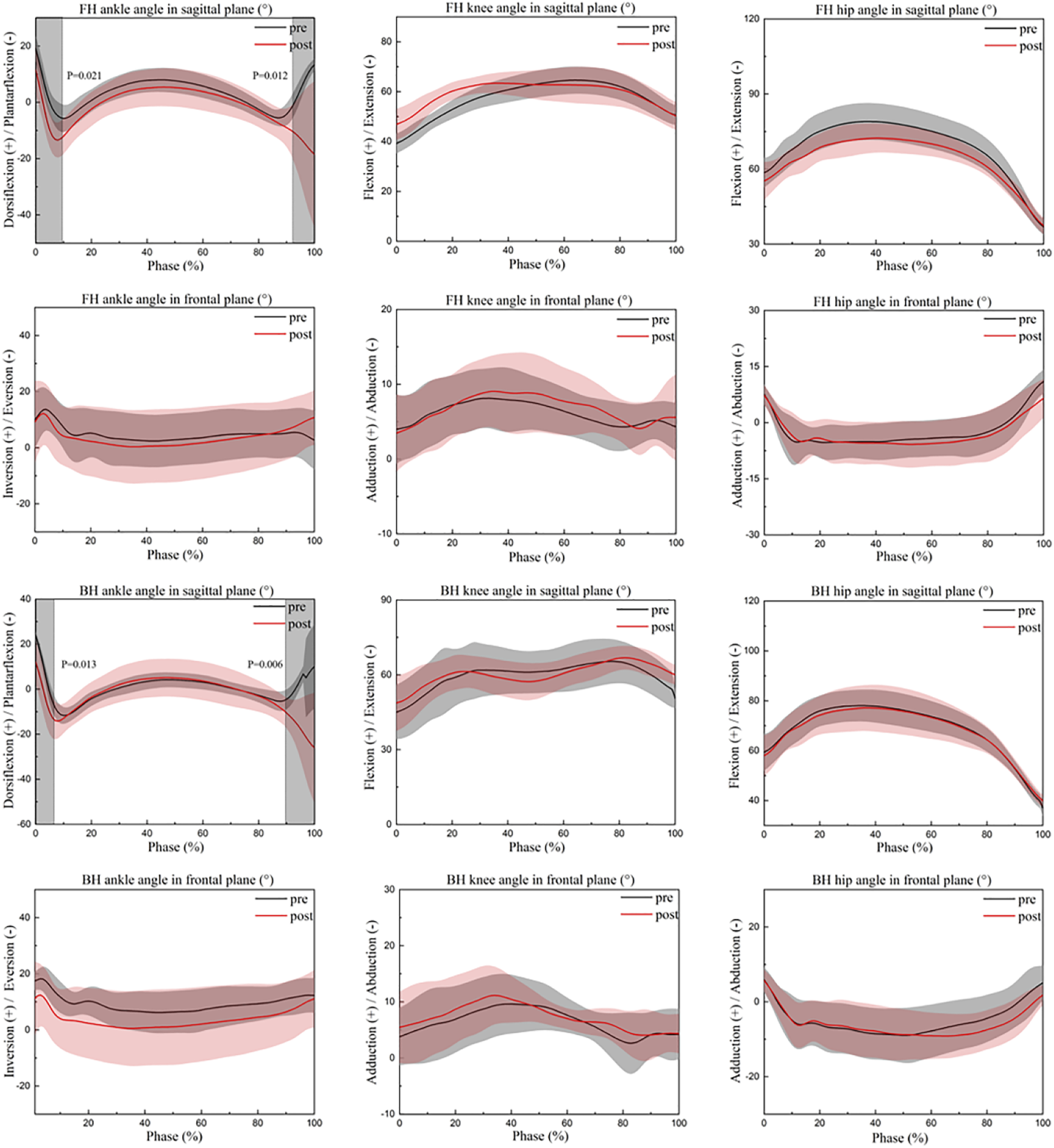 In the sagittal plane, peak ankle plantarflexion angle was significantly increased (t = 2.176, p = 0.034) and peak ankle dorsiflexion angle (t = −3.403, p = 0.001) were significantly reduced when athletes performed FH after fatigue of the dorsiflexor, hence ankle plantarflexion-dorsiflexion ROM was significantly increased (t = −3.820, p = 0.001) (Table 1). The peak knee flexion angle (Max: t = −5.600, p < 0.001; Min: t = −10.042, p < 0.001) and knee sagittal ROM (t = −2.716, p = 0.009) were significantly greater than pre-fatigue during the FH. Peak hip flexion angle (t = 5.774, p < 0.001) and hip sagittal ROM (t = 5.210, p < 0.001) were significantly reduced than pre-fatigue during the FH (Table 1). After fatigue, the peak knee flexion angle was significantly greater during BH than before fatigue (Max: t = −2.482, p = 0.017; Min: t = −2.143, p = 0.037) (Table 1).