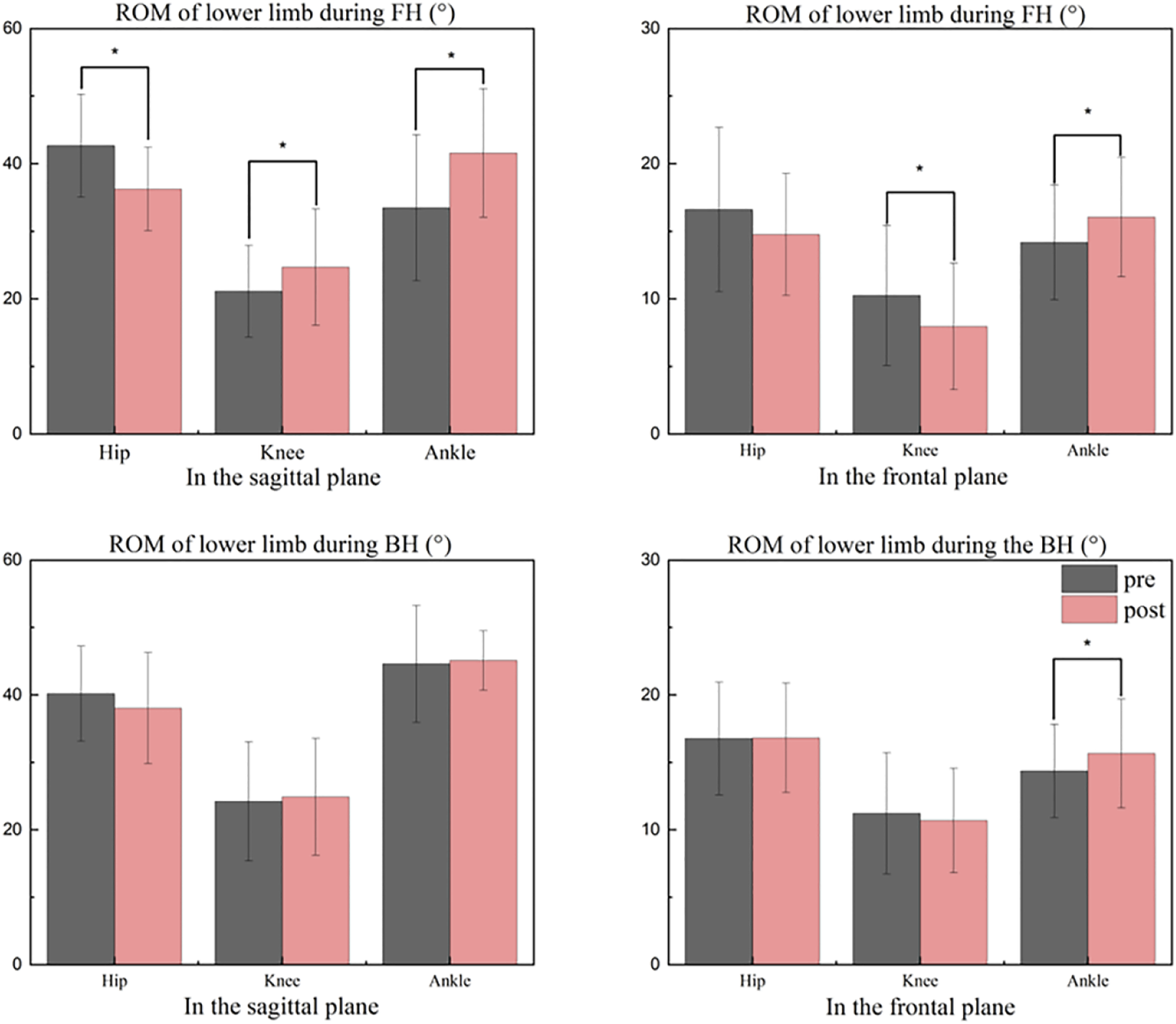 Comparisons between pre and after ROM levels during the strike period. FH, forehand lunge; BH, backhand lunge; pre, pre-fatigue, post, post-fatigue. *Significant differences at the hip, knee, and ankle (p < 0.05).