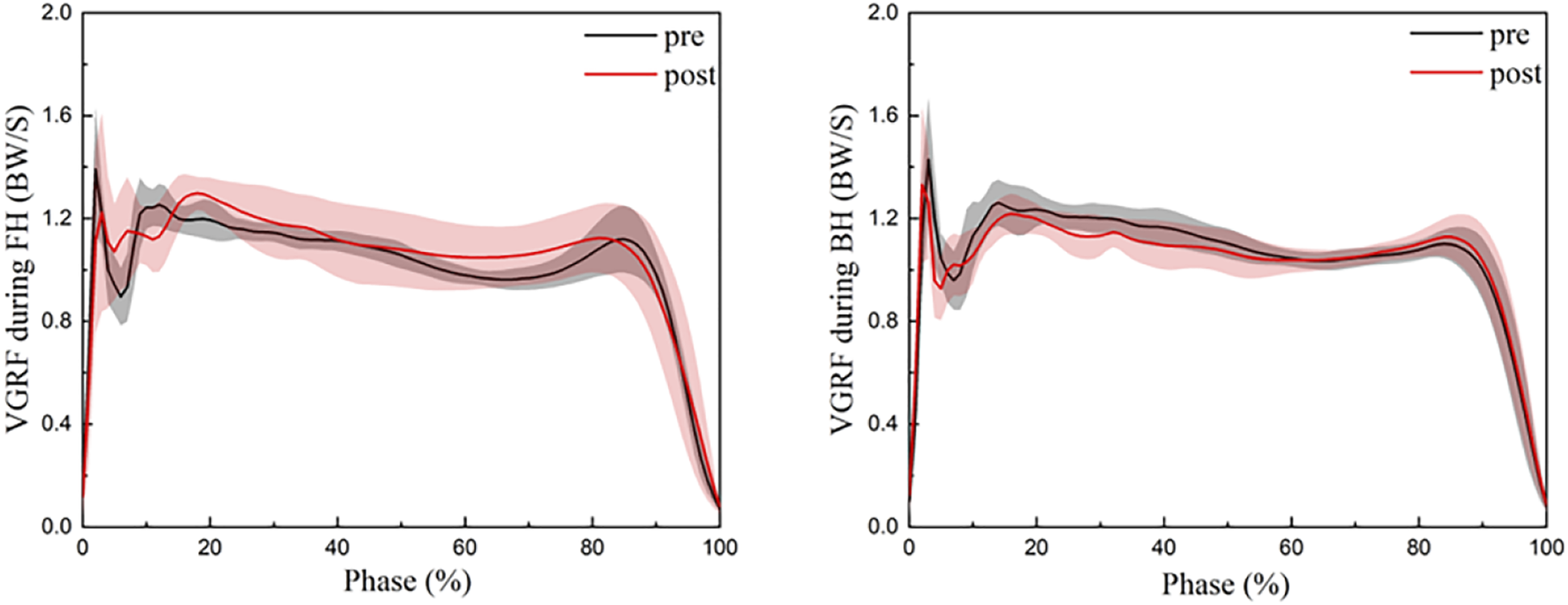 Change of the vertical GRF during the strike phase in the FH and BH. FH, forehand lunge; BH, backhand lunge; pre, pre-fatigue, post, post-fatigue.
