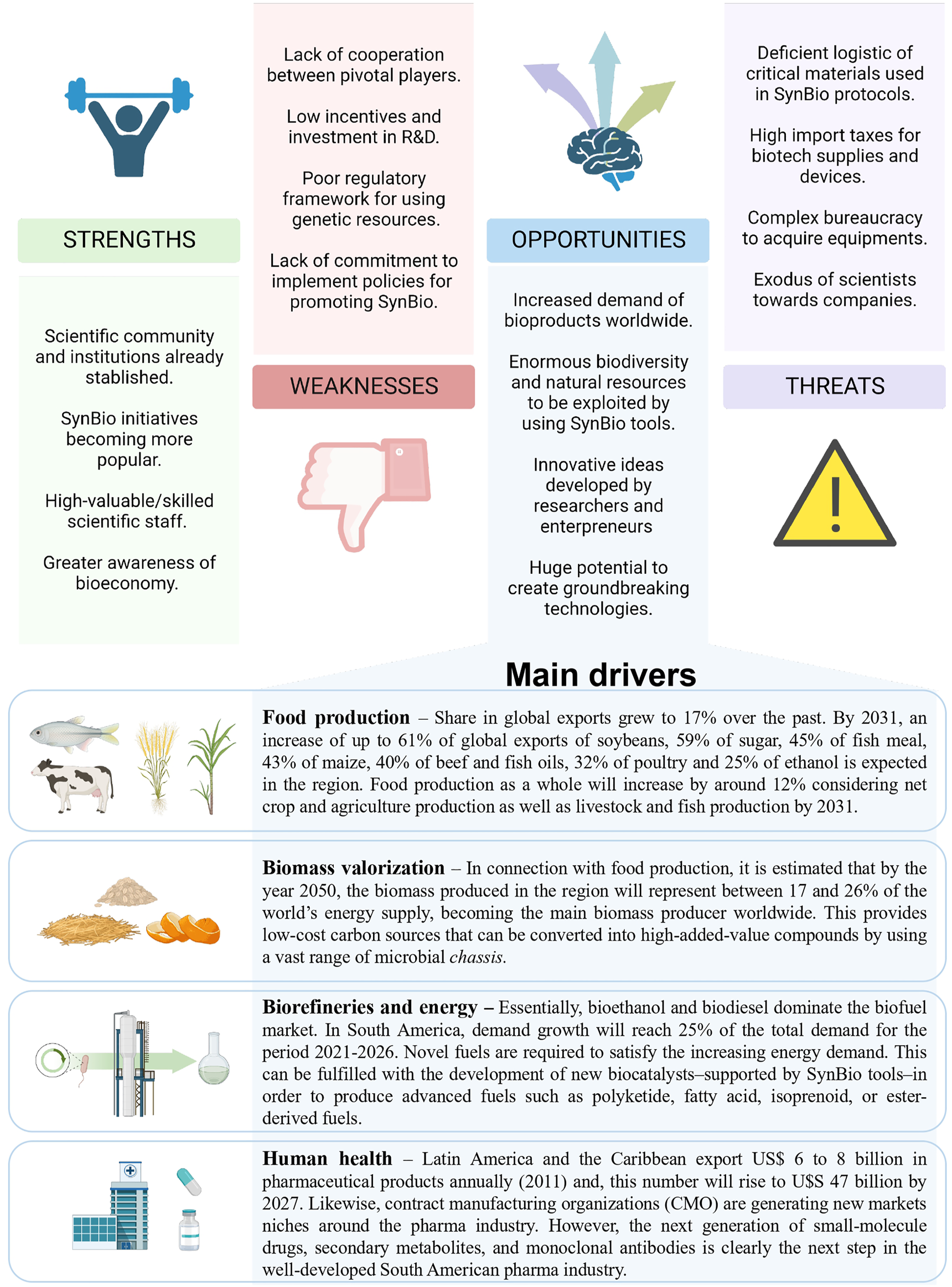 Finally, South America offers a wide variety of natural resources that can be exploited through SynBio to push forward local bioeconomies1. The region has enormous potential for biomass production -extensive arable lands and suitable soils-which allows the development of several production chains across the countries. In the same direction, as part of the activities carried out in the primary sector (mainly agriculture and livestock), a large amount of waste biomass is generated that can be used as low-cost carbon sources to produce high-added value compounds2 (Vargas-García et al., 2021; OECD and FAO 2022). In the last 2 decades, a substantial increase in the market volume was is observed in the beforementioned strategic areas3,4. It is worth mentioning that areas such as biorefineries, agriculture, food and beverage production as well as active pharmaceutical ingredients (API) represent the major source of opportunities in the region (Niosi et al., 2013; Sasson and Malpica 2018; Keasling et al., 2021). Another aspect to take into account is the presence of a deep dichotomy between primary commodity-producing sectors and manufacturing industries. While the first is widely predominant, an expansion in technical and more advanced industrial capabilities are needed in order to capitalize the efforts into a greener bioeconomy (Mealy and Teytelboym 2022). SynBio can play an important role to strengthen the link between the primary sector and producing companies in the upcoming years.