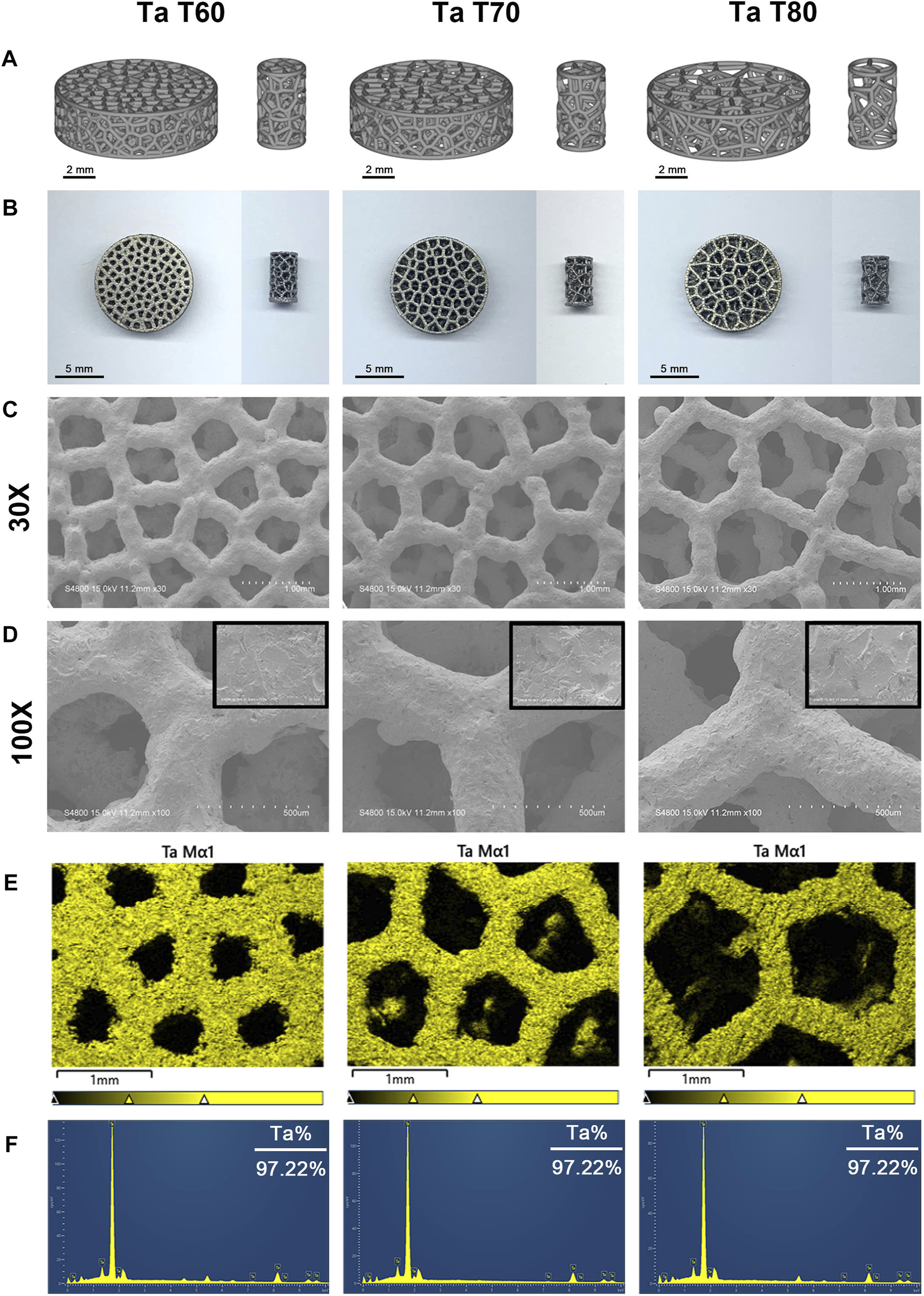Material characterization of three porous tantalum scaffolds with different porosities. 3D modeling (A) and general appearance (B) of porous tantalum scaffolds (left: disks, right: cylinders). (C) and (D) Surface morphology of porous tantalum scaffolds under electron microscopy at ×30 (C) and ×100 (D) magnification, respectively (The upper right corner of Figure D is 1,000x magnification). EDS mapping (E) and spectra (F) show the elemental distribution and composition of each scaffold.