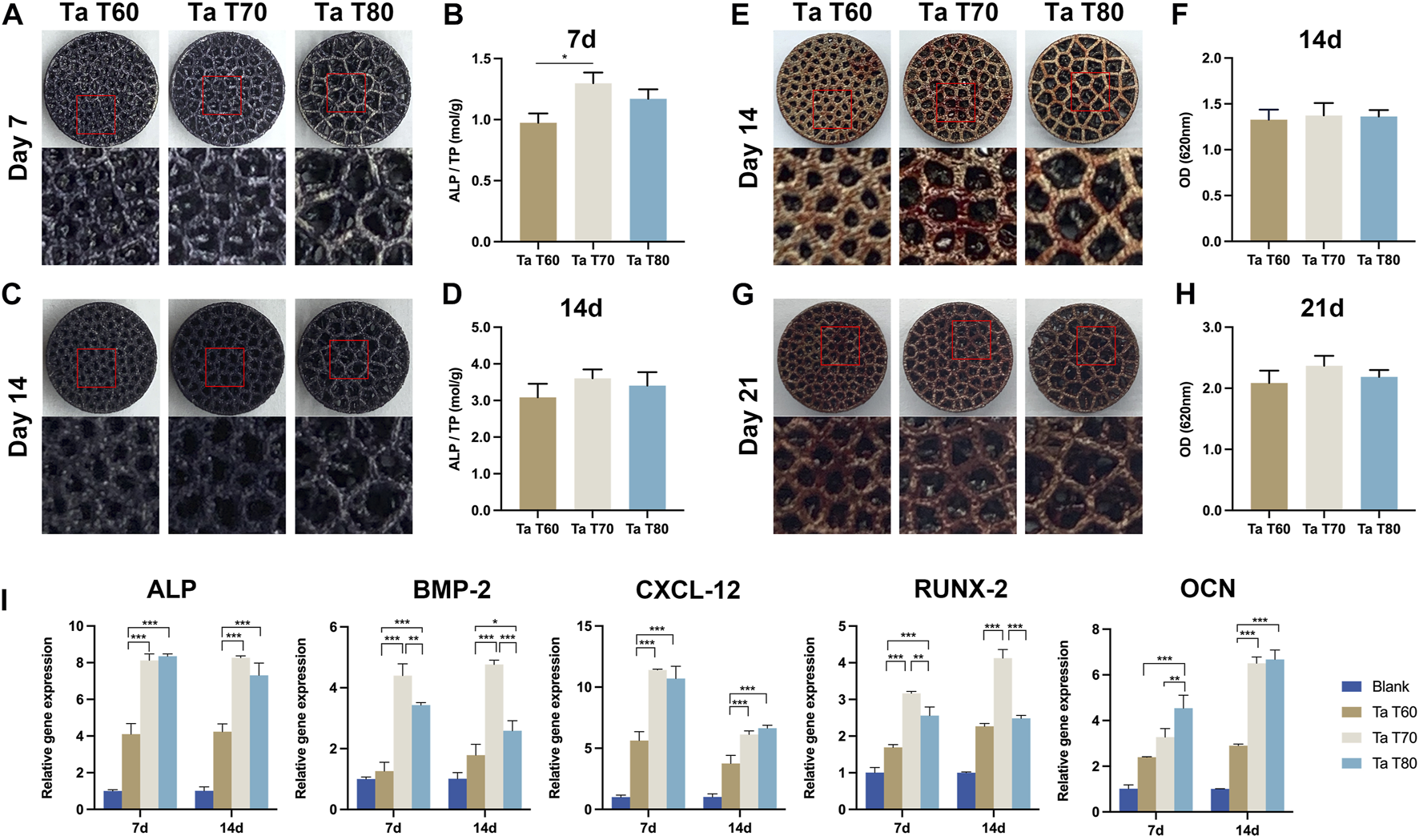 In vitro osteogenic effect of rBMSCs in each porous tantalum scaffold. (A) and (C) Appearance of ALP staining at 7d and 14d. (B) and (D) Quantitative assessment of ALP activity at 7d and 14d of culture. (E) and (G) Appearance of alizarin red staining at 14d and 21d. (F) and (H) Semi-quantitative analysis of alizarin red staining. (I) Osteogenesis-related gene expression at 7d and 14d of culture. Data represent mean ± SD. (n = 3, *p < 0.05; **p < 0.01; ***p < 0.001).