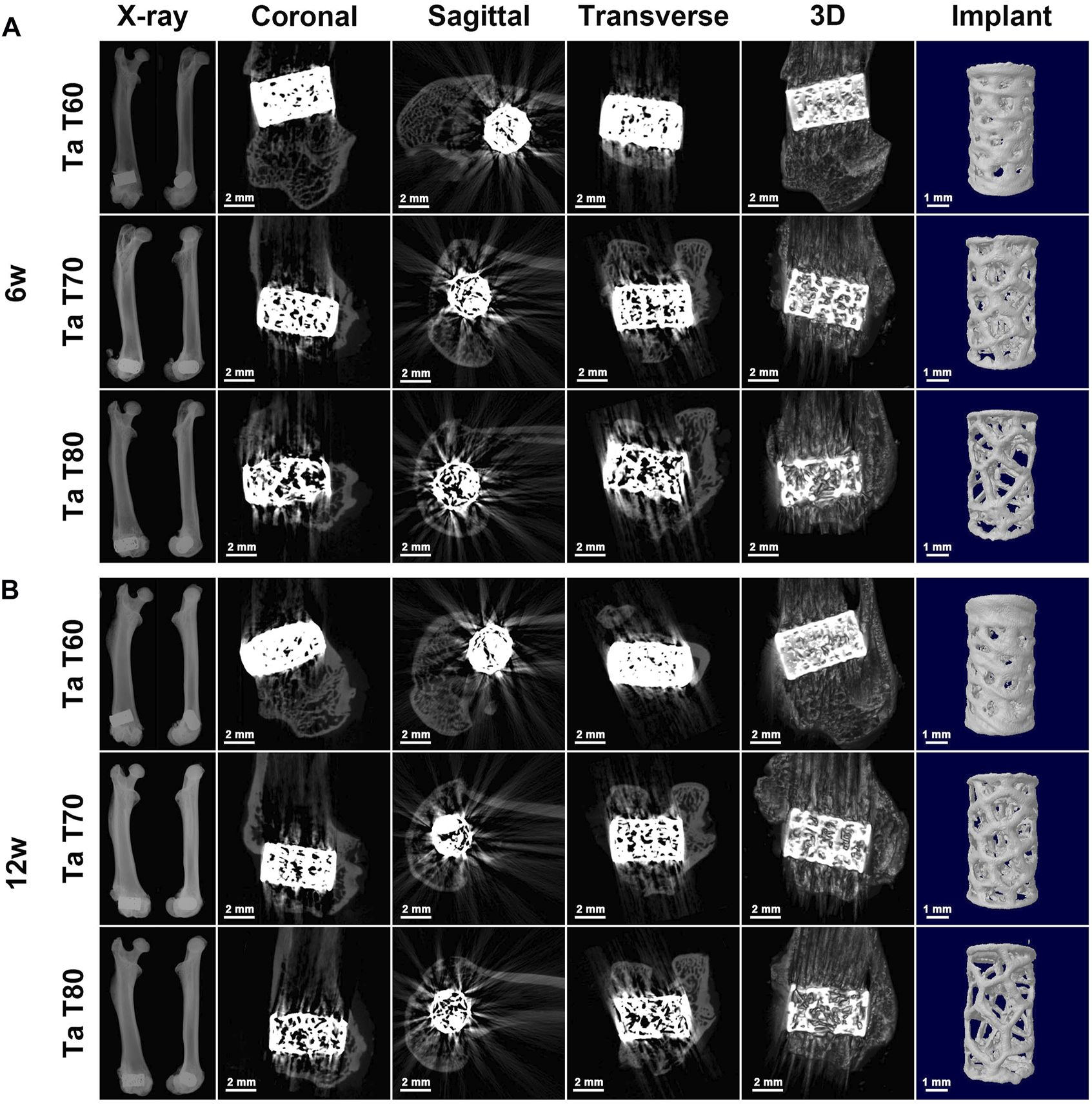 Radiological evaluation of tantalum scaffolds with different porosities implanted in rats. Representative X-ray images and corresponding 2D and 3D construction micro-CT images of the rat femoral condyle as well as the implant at 6w (A) and 12w (B) after surgery.