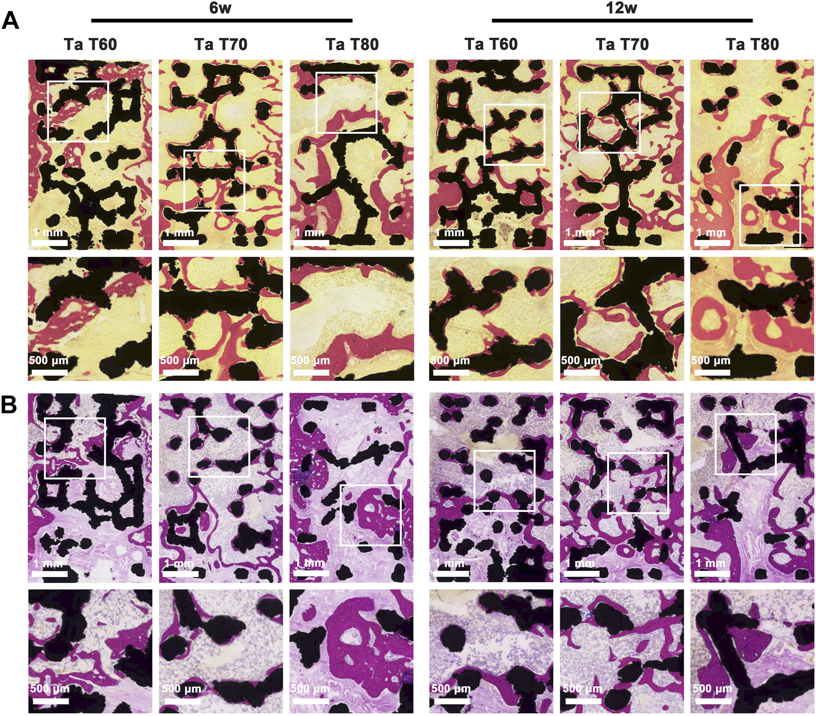 Bone growth in vivo evaluated by longitudinal-sectioning of porous tantalum scaffolds at 6w and 12w postoperatively. (A) Van Gieson staining and (B) methylene blue staining of undecalcified sections.