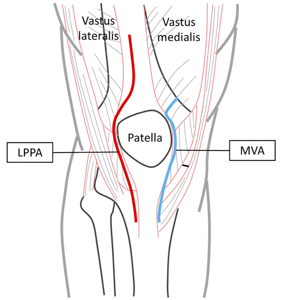 Surgical approaches for TKA—lateral parapatellar approach (LPPA, red line) and mid-vastus approach (MVA, blue line).