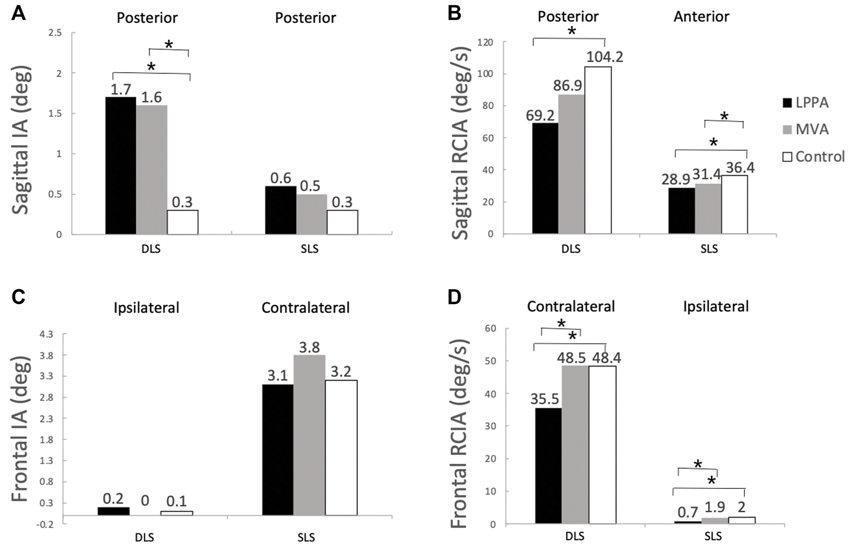 Compared to Control, the LPPA group showed significantly greater average IA during DLS but with less range of IA and average RCIA throughout the gait cycle in the sagittal plane (Table 2) (Figures 3, 4). In the frontal plane, the LPPA also showed significantly less average RCIA throughout the gait cycle (Table 3) (Figures 3, 4). On the other hand, the MVA group showed significantly greater average IA during DLS but significantly less average RCIA during SLS in the sagittal plane (Table 2) (Figures 3, 4). In the frontal plane, the MVA group showed significantly greater average IA during SLS (Table 3) (Figures 3, 4).