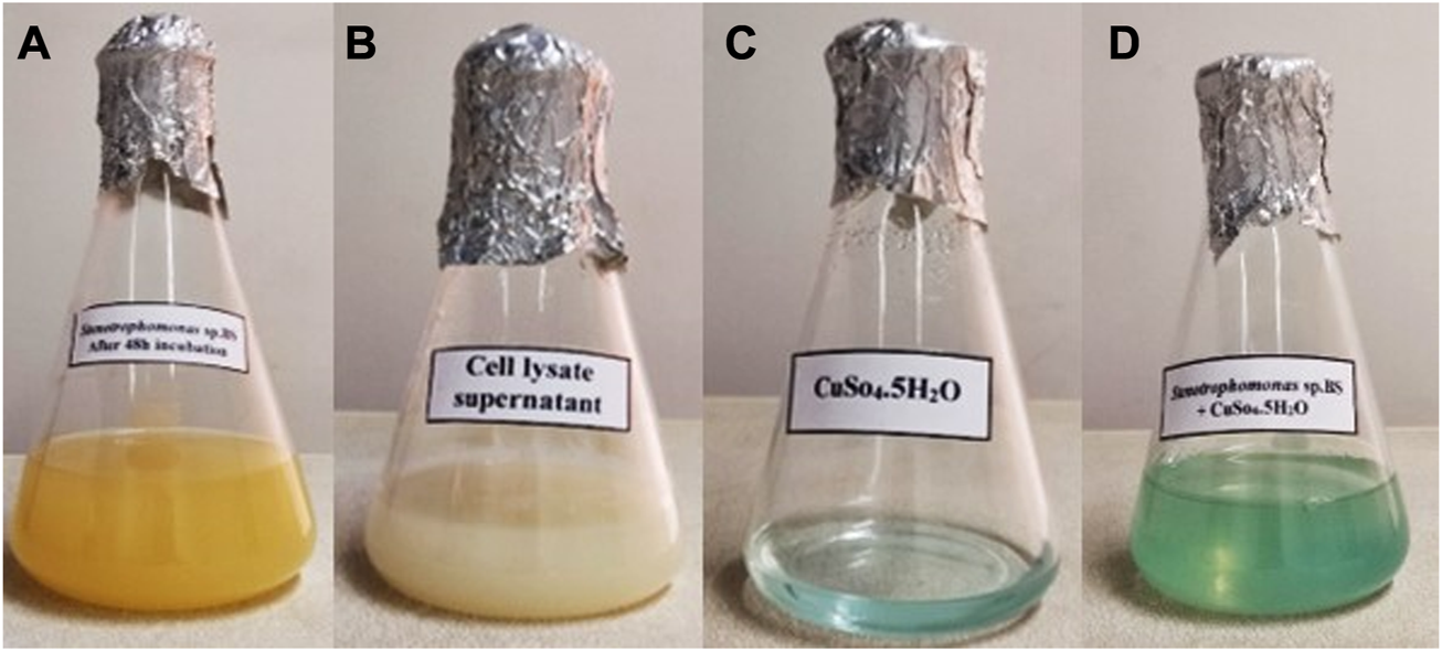 In the present study, synthesis of CuONPs was carried out using CLS of a psychrotolerant Stenotrophomonas species. In this approach, complicated downstream processes were not required and thus, the risk of microbial contamination was low. The biosynthesis of CuONPs was validated by monitoring four flasks containing Stenotrophomonas sp. BS95 after 48 h incubation, bacterial CLS, CuSO4 solution and the reaction mixture of bacterial CLS with CuSO4 (Figure 1). The instant precipitation of green aggregates, which did not change over 24 h incubation, indicated the formation of CuONPs.