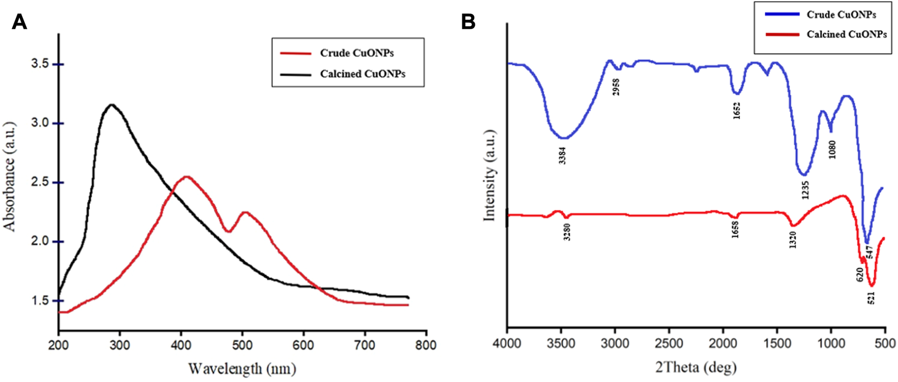 UV-vis spectroscopy was carried out to obtain optical properties of crude and calcined CuONPs. As presented in Figure 2A, surface plasmon resonance (SPR) peaks were recorded at 286 and 420 nm, which were assigned to efficient bio-reduction of CuSO4 to CuONPs. Since the shift of UV-vis absorbance toward short wavelengths is mainly attributed to decrease in the NP size, the left shift observed in UV spectrum was associated with the small size of our biogenic crude CuONPs.