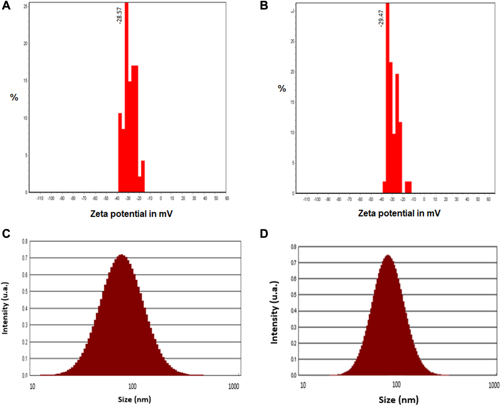 FIGURE 4. Zeta potential histograms (A, B) and particle size distribution pattern (C, D) of crude (A, C) and calcined (B, D) CuONPs.