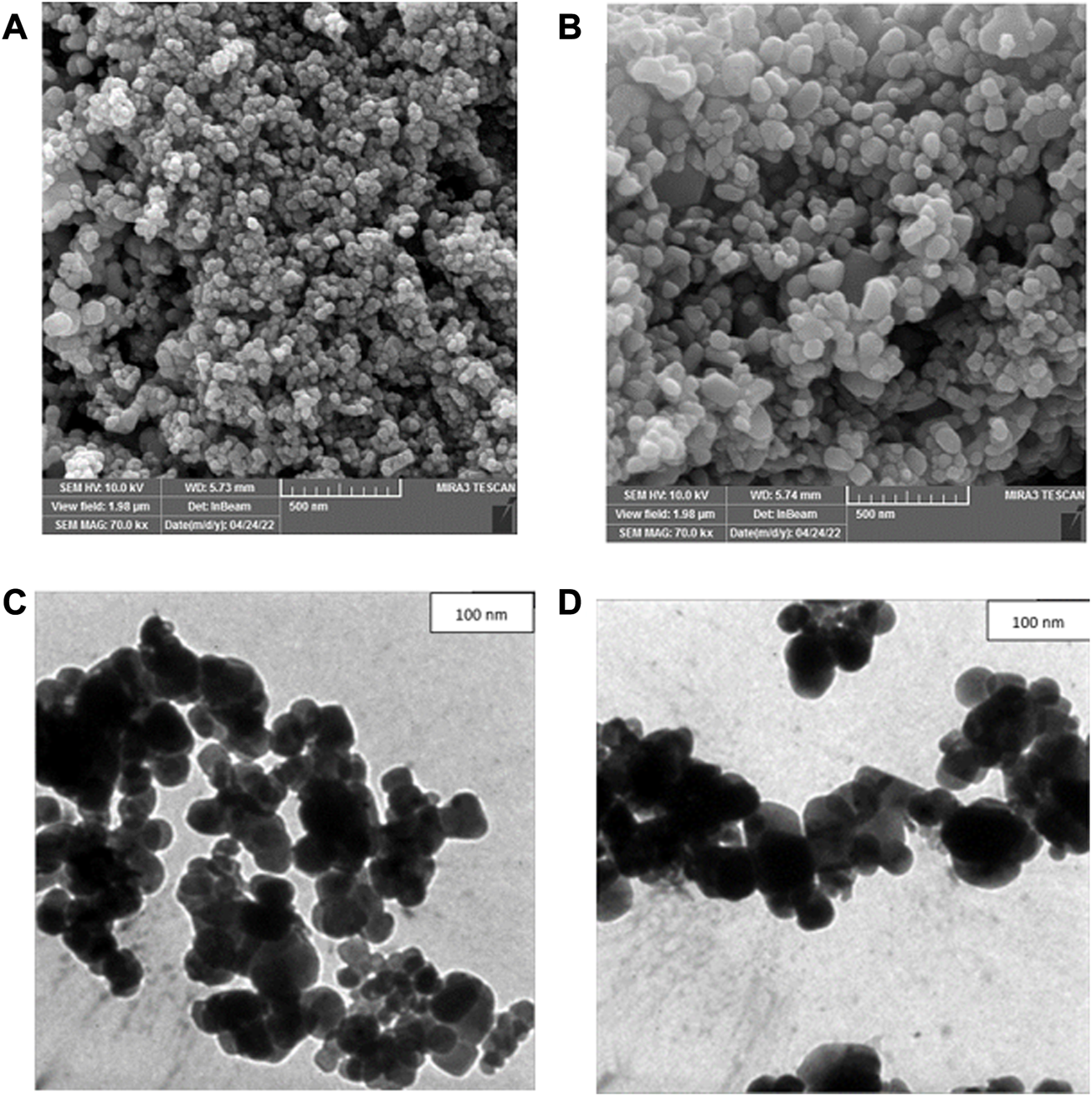 FESEM was used to determine morphology and size details of biogenic CuONPs. As presented in Figures 5A, B, crude and calcined CuONPs were spherical particles with the average PSD of 37.73 ± 3.27 and 48.37 ± 5.17 nm, respectively. Likewise, TEM micrographs revealed that crude and calcined CuONPs were roughly spherical particles with PSD values of 35.24 ± 4.64 and 43.68 ± 2.31 nm, respectively (Figures 5C, D).