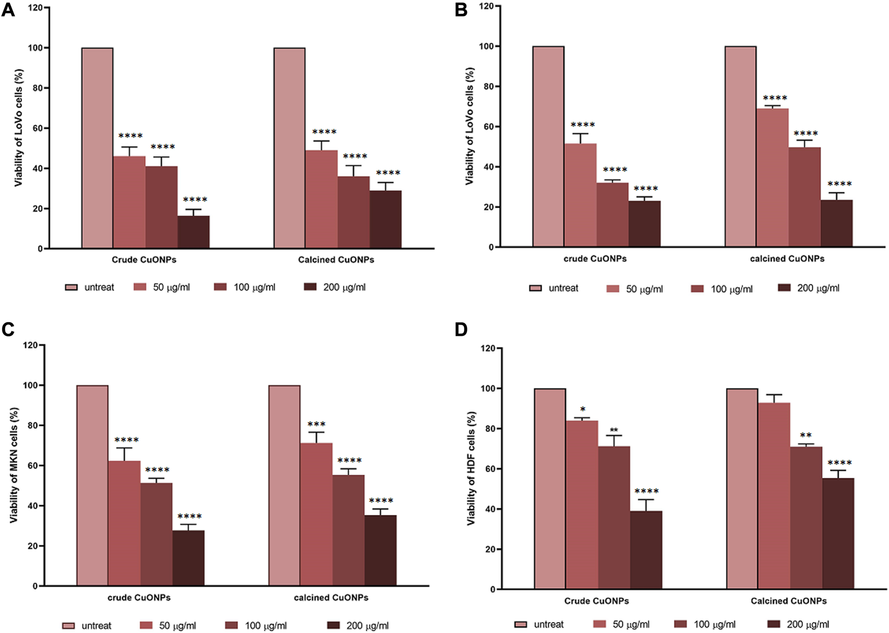 FIGURE 8. Dose-response curves representing the effects of crude and calcined CuONPs on viability of LoVo cells in normoxic (A) and hypoxic conditions (B), MKN-45 cells (C), and HDF cells (D). Results are shown as mean ± SD. *p < 0.05, **p < 0.01***p < 0.001 and ****p < 0.0001 indicate significant difference with untreated cells.