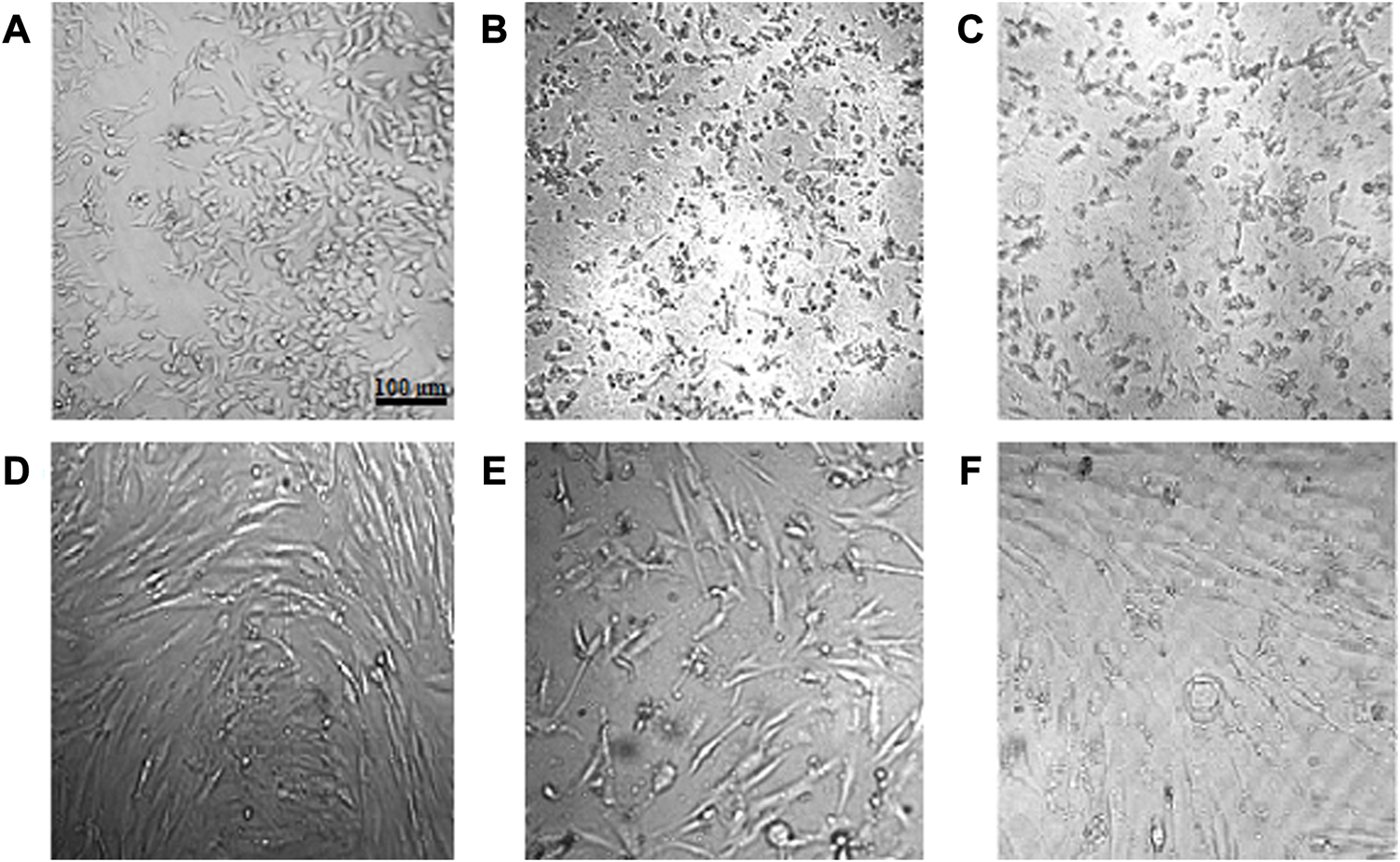 FIGURE 9. Morphological alterations of cells after administration of crude and calcined CuONPs. Phase contrast photomicrographs of LoVo (A–C) and HDF (D–F) cells; untreated (A, D), treated with 200 μg/mL crude (B, E) and calcined (C, F) CuONPs.