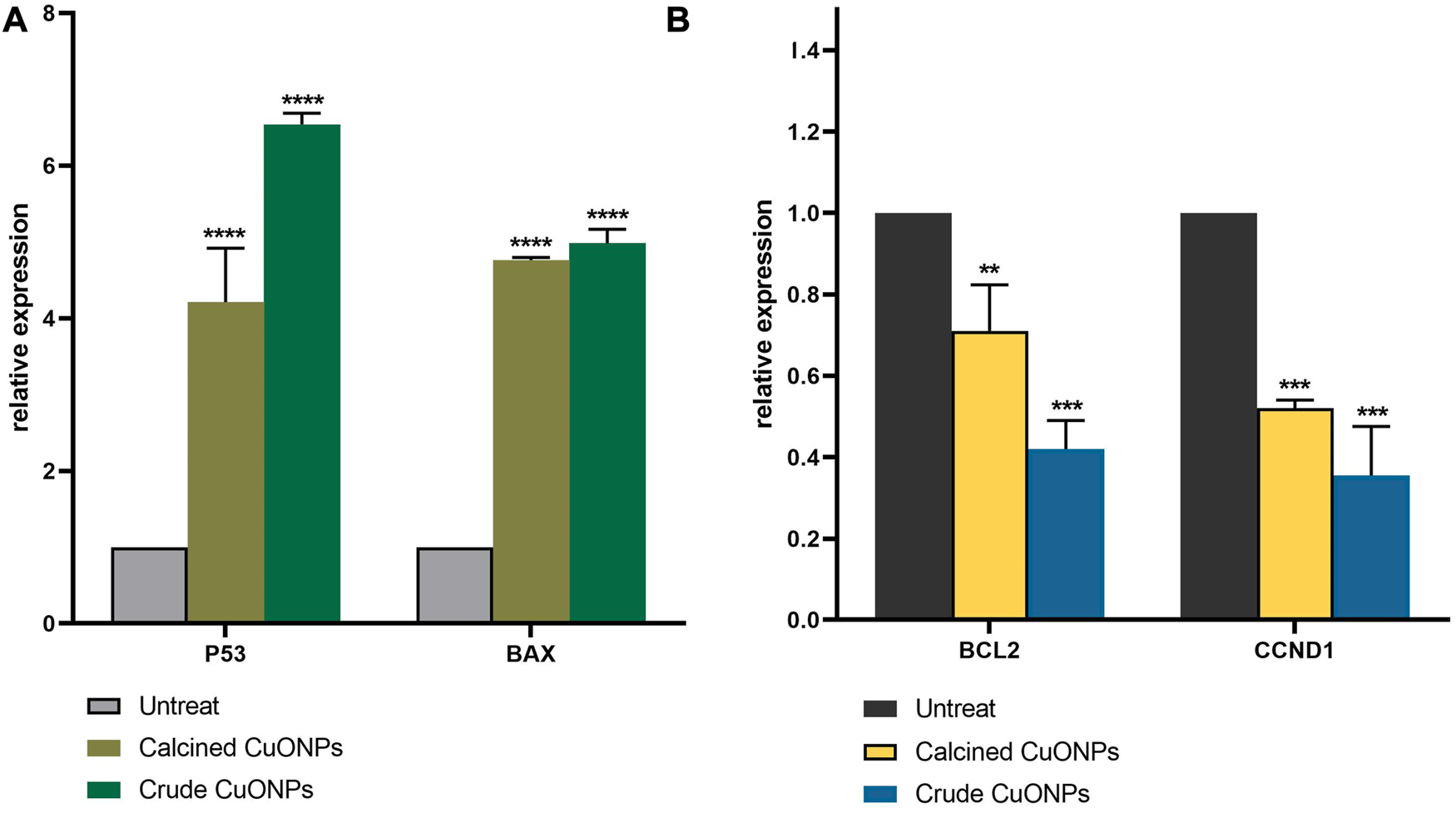 FIGURE 10. Analysis of gene expression by real-time PCR. The expression of P53, BAX (A), BCL2 and CCND1 (B) were normalized and plotted as relative fold change compared with the untreated cells. Data are represented as mean ± SD. **p < 0.01, ***p < 0.001, ****p < 0.0001 indicate significant difference with untreated cells.