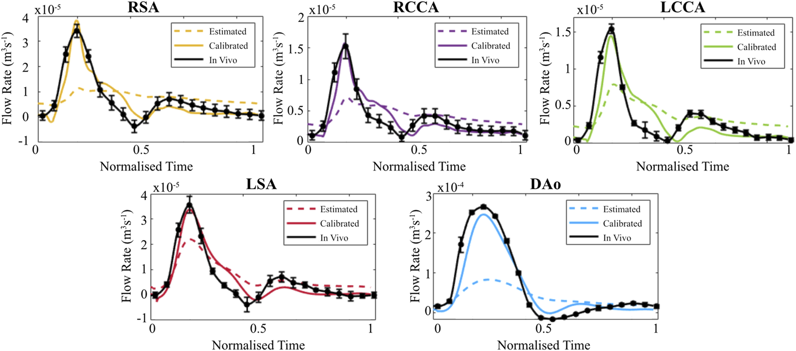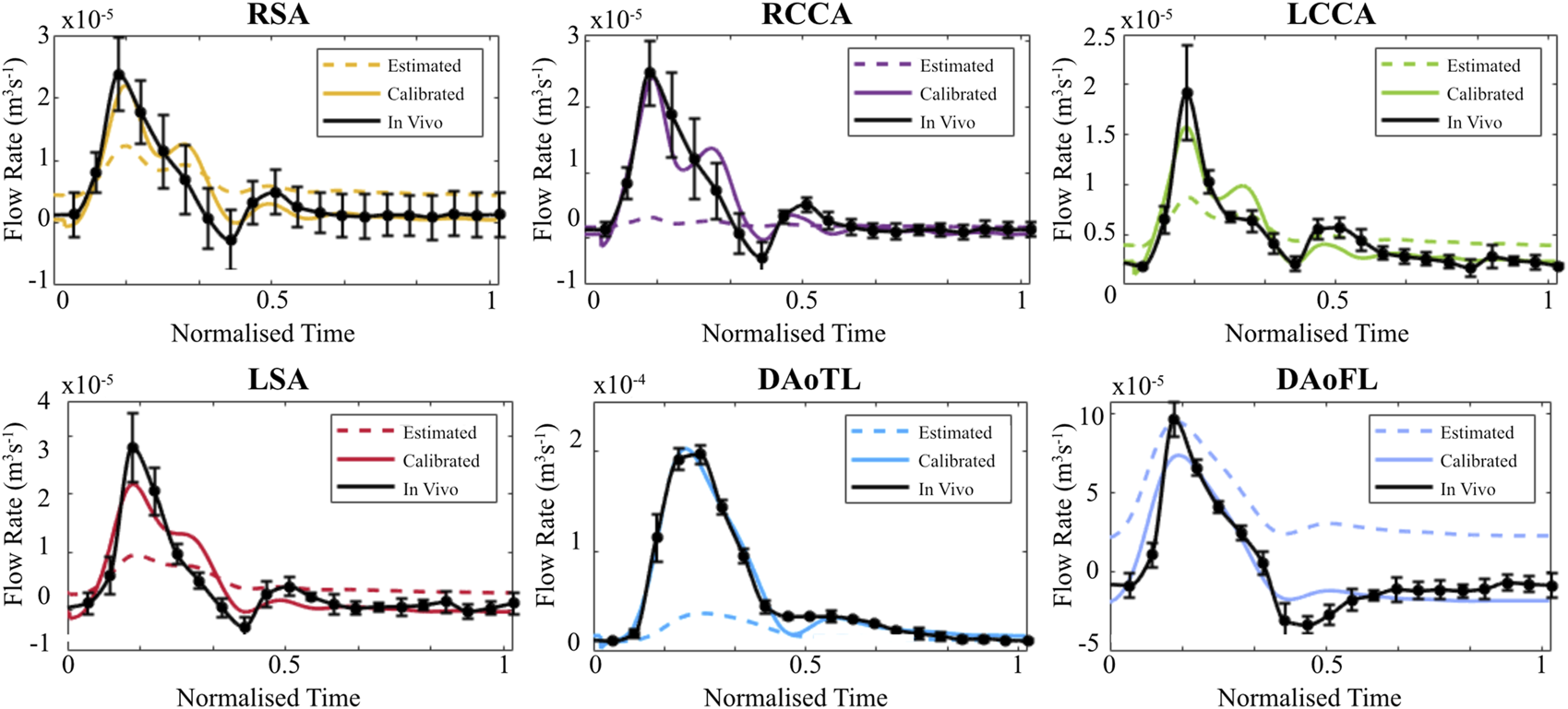 When evaluated within the 0D Matlab® framework, the calibrated parameters yield a more accurate and physiologically relevant flow waveform for each branch of the thoracic aorta for the AD patient (Figure 5) and healthy volunteer (Figure 6). In both cases, the calibrated parameters dramatically reduced the cumulative least squares difference (LSD) error between the computed and in vivo data. Regarding the dissected case, the error for the RSA, RCCA, LCCA, LSA, DAoTL, and DAoFL, was reduced with respect to the estimated parameters by 75.1%, 88.6%, 74.4%, 74.5%, 98.9%, and 92.2%, respectively. In the healthy case, these cumulative LSD errors were reduced by 81.8%, 75.3%, 56.2%, 58.4% and 88.8%, respectively.