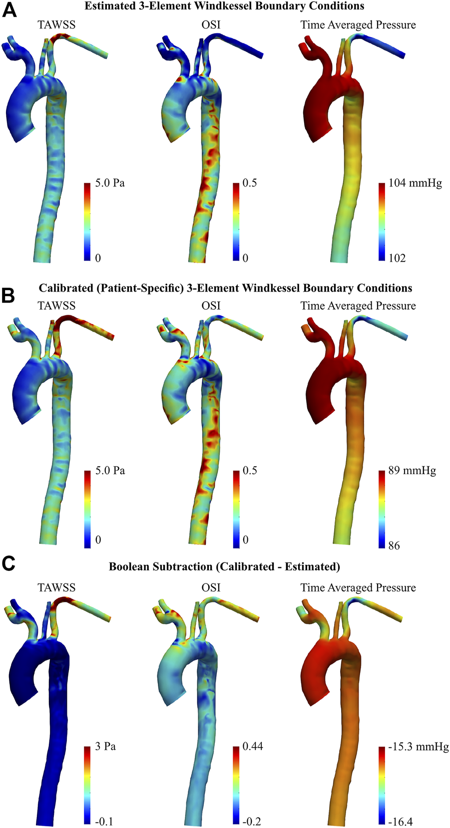 Discussion: This calibration methodology can therefore be applied in clinical cases where branch flow rates are known, for example, via 4D Flow-MRI or ultrasound, to generate patient-specific BCs for CFD models. It is then possible to elucidate, on a case-by-case basis, the highly individualized hemodynamics which occur due to geometric variations in aortic pathology high spatiotemporal resolution through CFD.