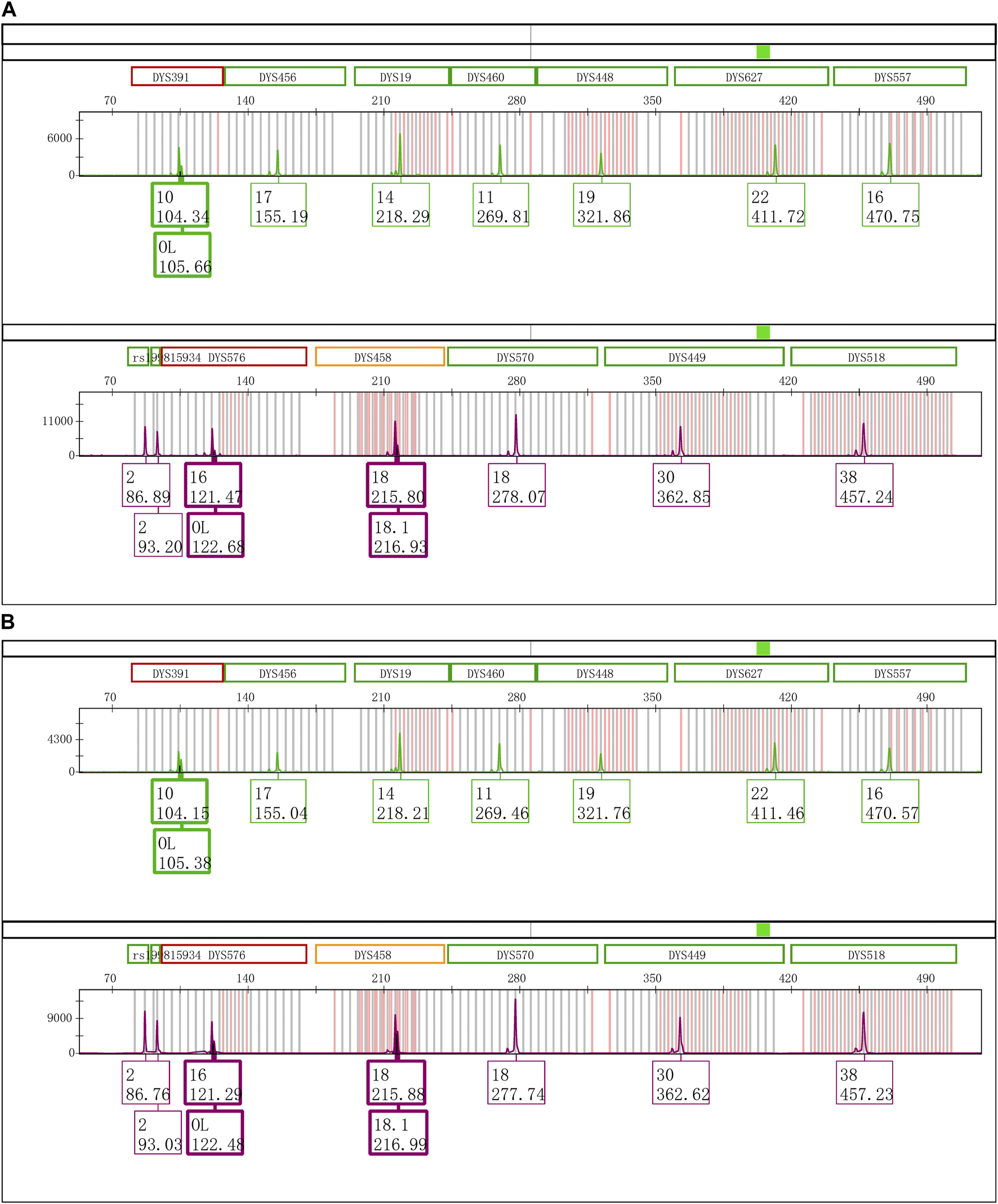Electrophoretogram results of the green dye channel in Y43CS. (A) The allelic peak of locus DYS391 with an extra peak of 105.50 bp. The extra peak was located on the right side of allele 10 at locus DYS391. The peak heights of allele 10 and extra peak were 6756 RFU and 2296 RFU, respectively, and the peak height ratio of extra peak to allele 10 was 0.3398. (B) The typical allelic peak of locus DYS391. The size of peak was 104.21 bp, and labeled as allele 10 with a height of 12496 RFU.