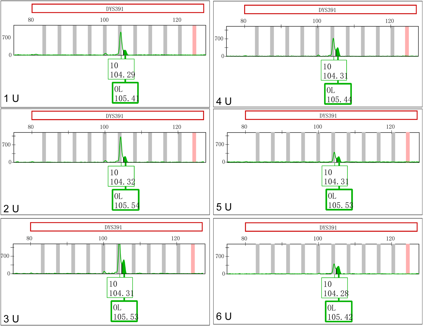 The concentrations of Taq DNA polymerase in the Y43CS with a 10.0 μL reaction volume were varied from 1 U to 6 U. The PCR products were placed at room temperature for one day to observe the appearances and changes of EASPs. As shown in Figure 3, the peak height ratios of artificial peaks to main peaks at locus DYS391 increased gradually when the concentrations of DNA polymerases increased. The peak height ratios were 0.2119, 0.2272, 0.3871, 0.4746, 0.5414 and 0.7618 at the concentrations of 1 U, 2 U, 3 U, 4 U, 5 U and 6 U, respectively. The appearances and changes of EASPs at loci DYS576 and DYS458 were similar to those observed at locus DYS391, the difference was that the artifact appeared as a shoulder peak on the right side of the main peak. When the concentration of Taq DNA polymerase increased to 6 U, the extra peak appeared at locus DYS576 was labeled as an OL peak (Supplementary Figure S4). Except for loci DYS391, DYS576 and DYS458, no additional peaks appeared at other loci in the polymerase variation experiments, so only these three loci were displayed in Figure 3 and Supplementary Figure S4.
