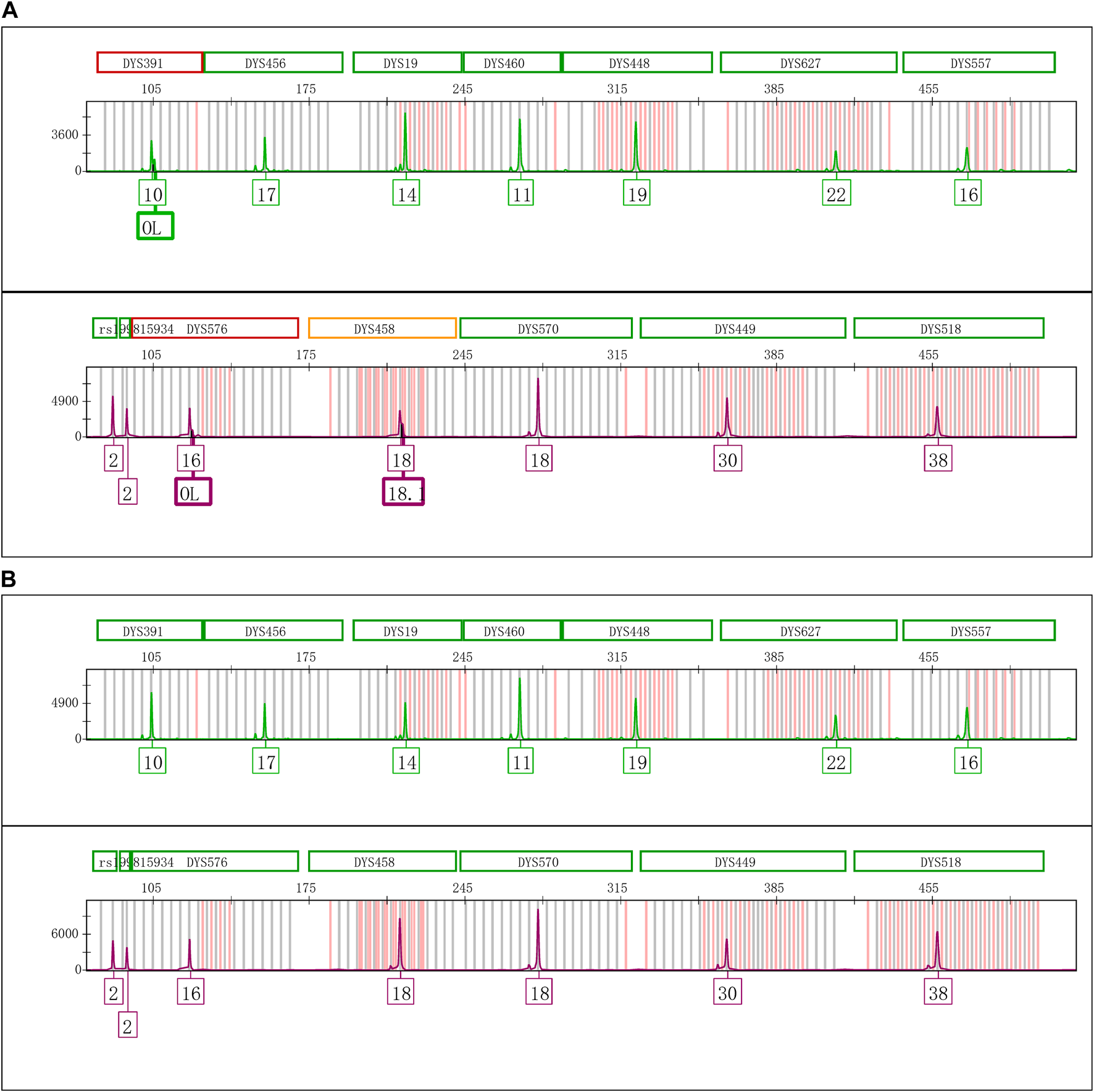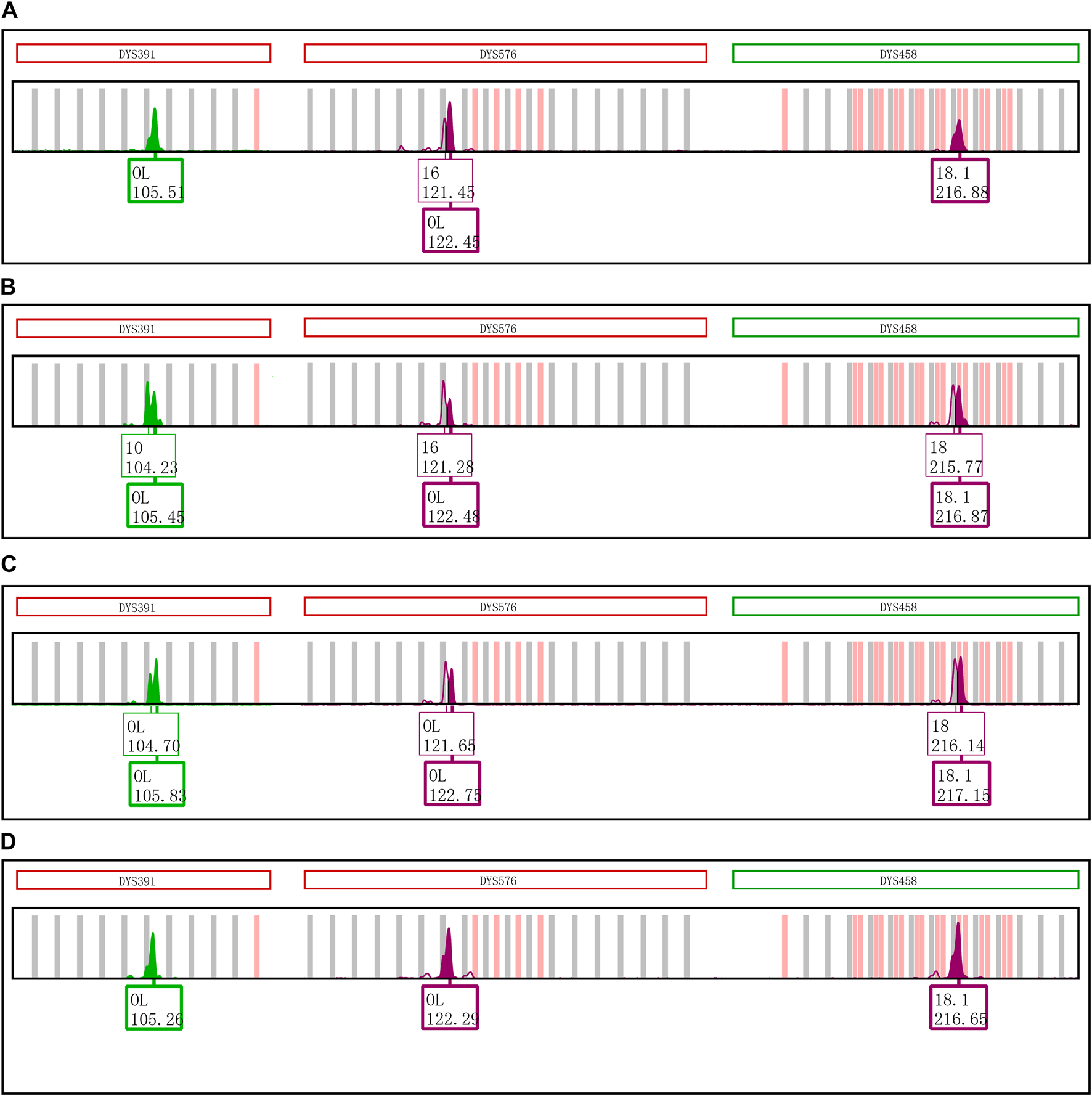 In the re-detection of our recently obtained Y-chromosomal short tandem repeat (Y-STR) PCR amplified products, we found that a class of unexpected experimental artifacts were observed at loci DYS391, DYS576 and DYS458 in a recently released commercial Y-STR kit. From the size and location of the extra peak in the genotyping profile, these artificial peaks were not exactly the same as the split peak defined by Butler (Butler, 2015). According to the electrophoresis results which performed on Applied Biosystems 3500xL Genetic Analyzer, the observed artifact in size was approximately one base longer than the identified main peak. So, it located on the right side of the main allelic peak.