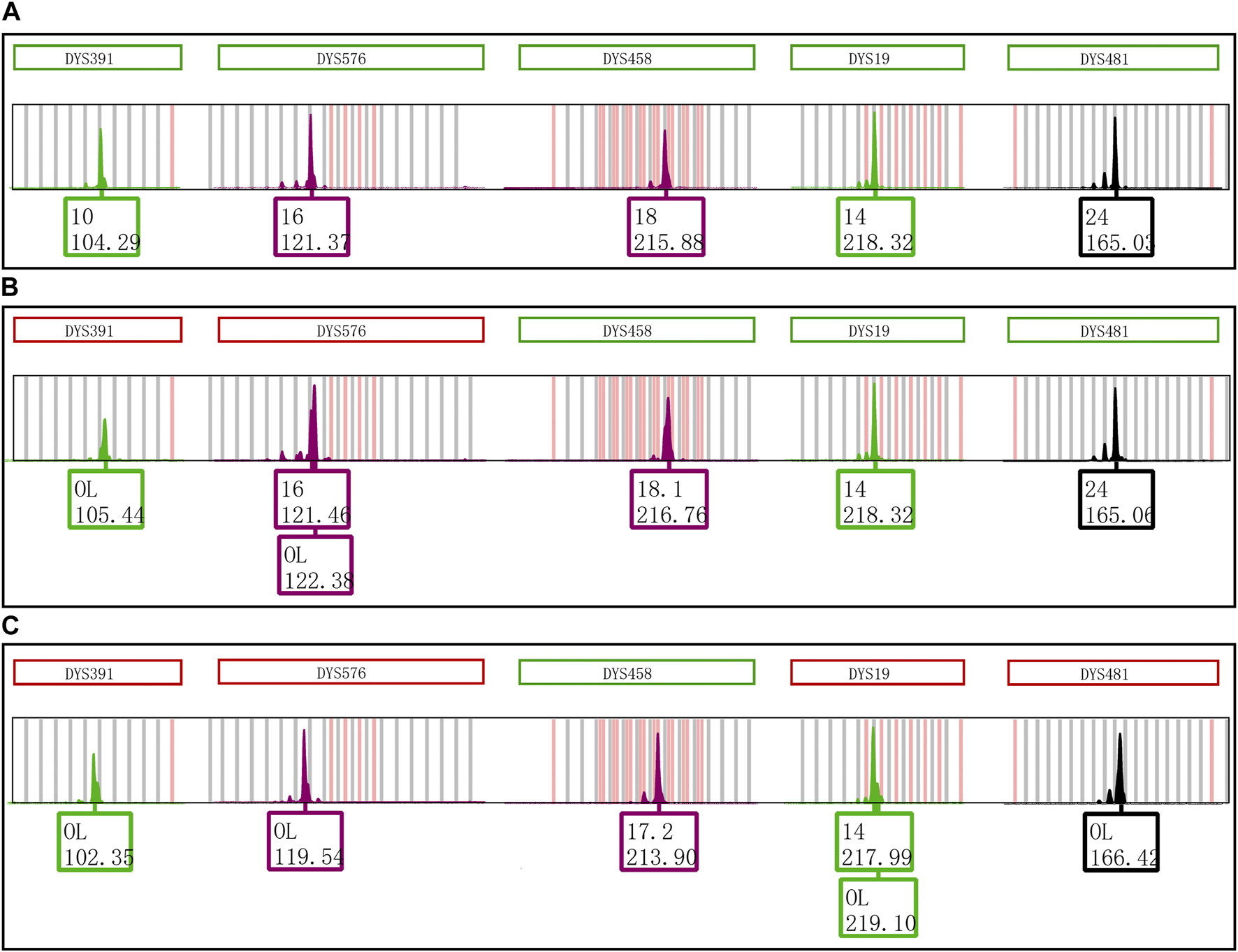There are at least two possible mechanisms for the formation of this artificial peak: (i) the secondary structure of the PCR amplified products (Bovo et al., 1999), (ii) the results of non-template extension by Taq DNA polymerase (Smith et al., 1995). Experiments were performed to verify the first hypothesis that the accidentally observed artifact is the secondary structure of PCR fragment. Firstly, the amplicon sequences of loci DYS19 (Accession Number, AN: AC017019), DYS576 (AN: AC010104) and DYS458 (AN: AC010902) in the Y43CS were analyzed by BioXM v2.7 and RNAstructure v6.1 software packages. Analysis results showed that the molecular structures of these loci do not exhibit the characteristics to form secondary structure preferentially (data not shown). Moreover, the following experimental results also show that this artifact cannot be eliminated by increasing loading mixture volume and conducting heat denaturation before injection. The results indicate that the extra peak may not be caused by double-stranded amplicons of these loci which formed under suboptimal electrophoresis conditions (McLaren et al., 2008; Zhou et al., 2020).