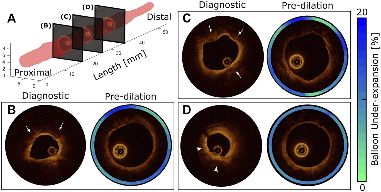 Diagnostic vs pre-dilation intravascular imaging for comprehensive morphology and material characterization of a representative target lesion. 3D representation of the artery lumen (A) and representative OCT slices at proximal (B), middle (C), and distal (D) locations. The presence of atherosclerosis is traditionally confirmed using diagnostic OCT conducted during diastole. According to the modified AHA criteria, the presence of fibrocalcific plaque is confirmed at slices (B) and (C) with protrusion of calcium into the lumen (arrows). Early stage fibroatheroma is also observed (arrowheads) toward the distal region (D) as characterized by superficial high backscattering bright signal and pronounced signal attenuation of light in the deeper plaque regions, which is probably secondary to the presence of activated macrophages, calcification, or both. After balloon inflation to 8ATM, the same artery segments were imaged, and the effect of local stiffness was quantified using balloon under-expansion relative to the diameter at 8ATM in an associated compliance table for the angioplasty balloon (contour plots).