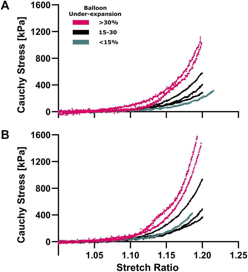 Hyperelastic characterization of coronary plaques in the circumferential (A) and longitudinal (B) directions. Equiaxial extension testing was performed to characterize material properties corresponding to under-expansion levels that are color coded for three range of <15% (aqua), 15%–30% (navy) and >30% (pink). Cauchy stress vs stretch curves were calculated from force/displacement and sample dimension data where non-linear hyperelastic behavior was observed in both directions.