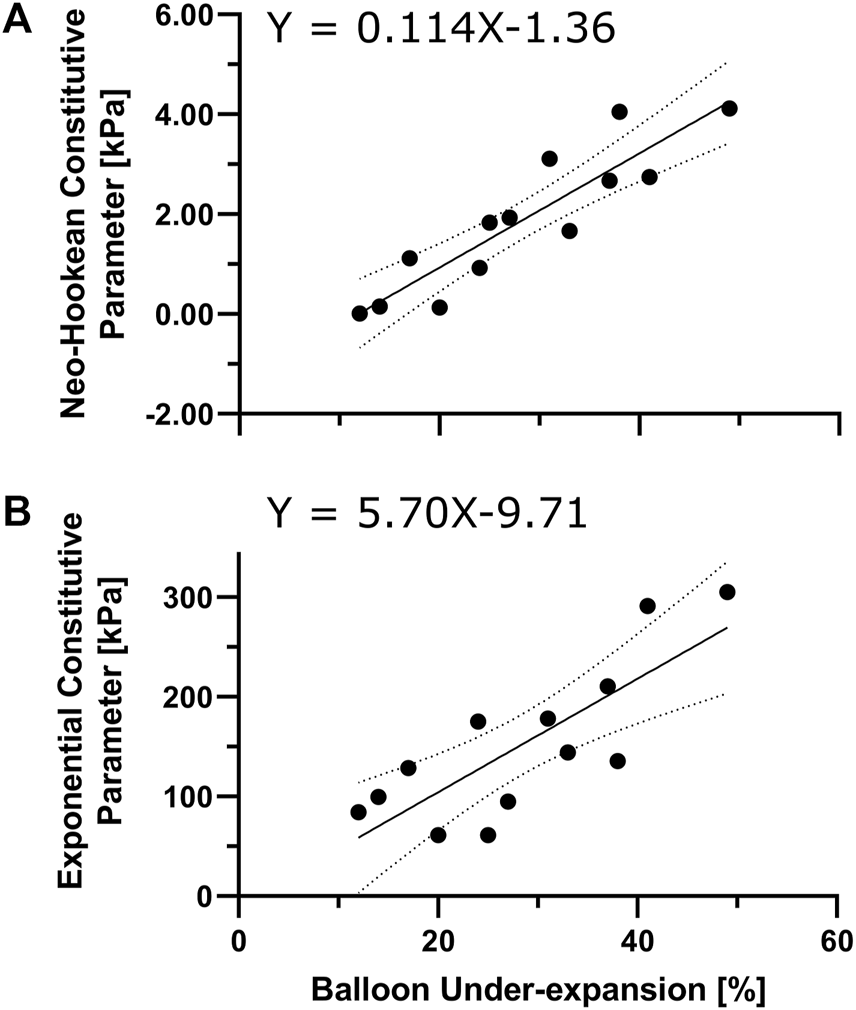 Characterization of local lesion material properties via angioplasty balloon under-expansion. Regression model to interpret neo-Hookean (A) and Exponential (B) stress-like parameters (i.e., and ) for direct constitutive characterization of the target lesions from angioplasty balloon under-expansion.