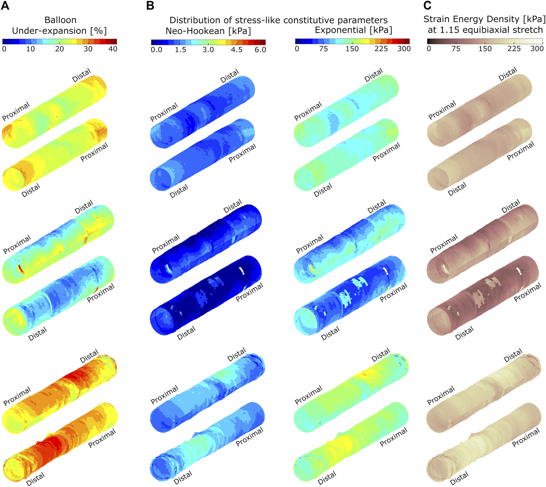 Spatial distributions of balloon under-expansion (A), stress-like constitutive material parameters (B), and strain energy density (C) for three representative atherosclerotic coronary arteries. Arteries are shown in two orientations and data are visualized on the luminal surface of the artery at pre-dilation. Balloon under-expansion was quantified as percent reduction in expanded radius relative to the expected nominal radius at 8 ATM using an associated compliance table. Stress-like Neo-Hookean and Exponential constitutive parameters are quantified through transfer functions identified empirically using biaxial extension testing results as shown in Figure 3. Strain energy density was calculated according to Eq. 1 and at a virtually applied 1.15 equibiaxial stretch ratio.