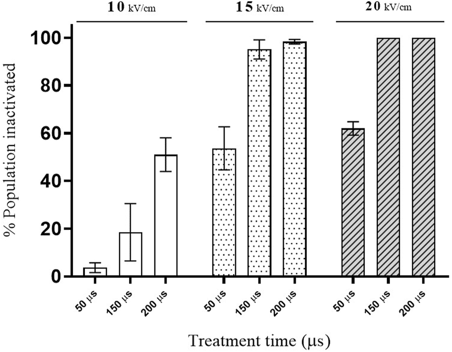 Figure 2 shows the influence of electric field strength and total treatment time, calculated by multiplying the total number of pulses applied by the pulse width, on % of S. cerevisae cells inactivated by PEF. At the lowest electric field investigated (10 kV/cm), the longest treatment (200 µs) caused a loss of viability in less of the 50% of the population. However, significant inactivation was detected at the lowest treatment time when the PEF treatments were applied at the two higher electric field strengths assayed (15 and 20 kV/cm). These results would indicate that the electric field threshold required for manifestation of electroporation of this strain of S. cerevisiae is around 10 kV/cm. Microbial inactivation by PEF is associated with the permanent permeabilization of the cytoplasmic membrane (electroporation), which leads to uncontrolled molecular transport across the membrane (Heinz et al., 2001; Álvarez et al., 2006; Mahnič-Kalamiza and Miklavčič, 2022). These data agree with those of other authors showing that electric fields higher than 10 kV/cm are required to achieve inactivation of several different strains of S. cerevisiae (Cserhalmi et al., 2002; Aronsson et al., 2005; Martínez et al., 2016).