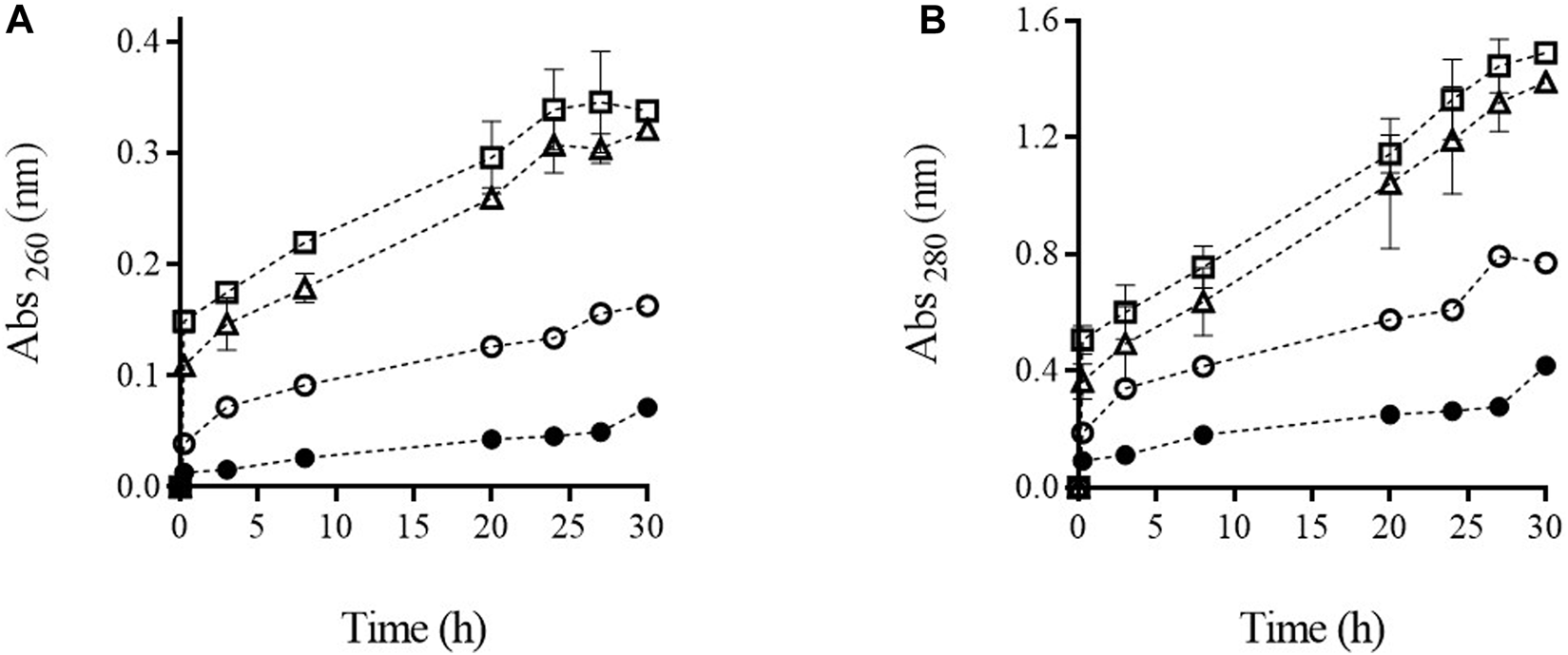 Absorbance at 260 nm (A) and 280 nm (B) of supernatant containing untreated (●) and PEF treated cells of S. cerevisiae cells at PEF1 (15 kV/cm 50 µs) (○), PEF2 (15 kV/cm 150 µs) (∆), and PEF3 (15 kV/cm 200 µs) (□) along the incubation time.
